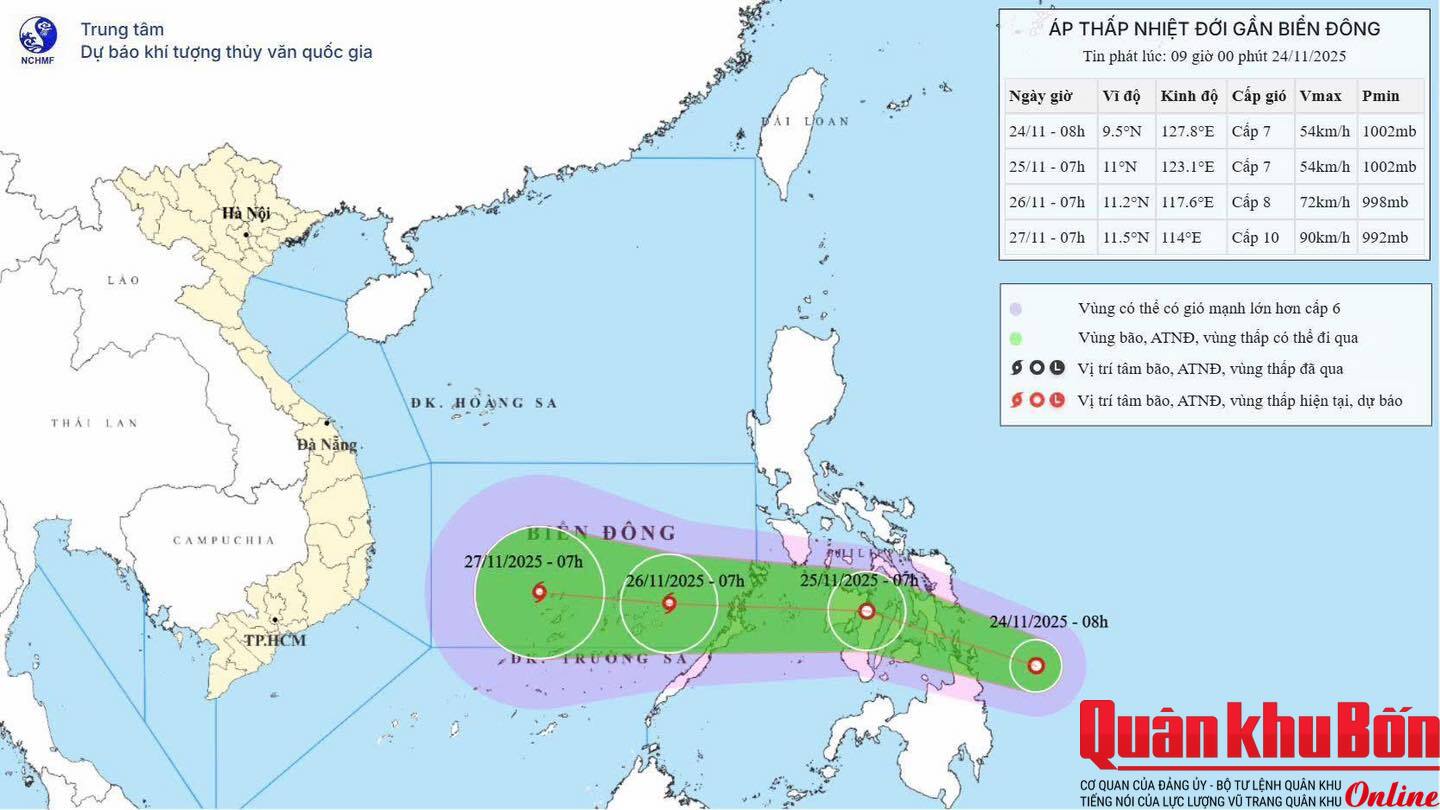 Khoảng đêm 25 rạng sáng 26-11, áp thấp nhiệt đới sẽ đi vào Biển Đông.