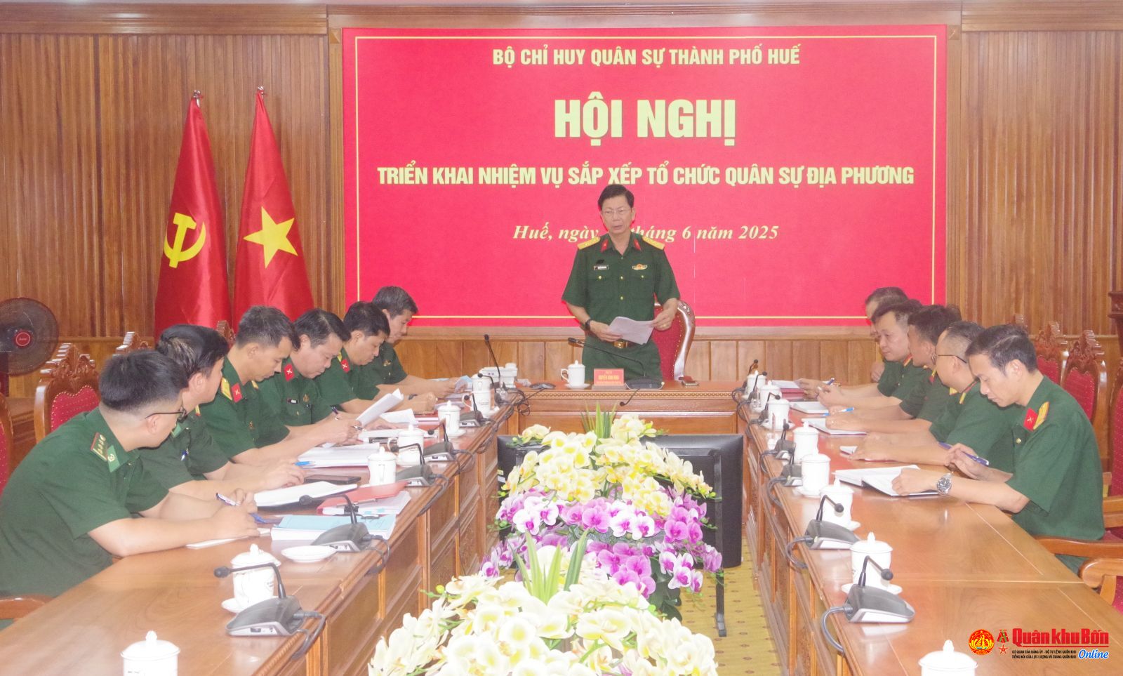 Chiều 17/6/2025, Bộ CHQS thành phố Huế tổ chức Hội nghị triển khai nhiệm vụ sắp xếp tổ chức quân sự địa phương. Đại tá Nguyễn Đình Khoa, Phó Chỉ huy trưởng Bộ CHQS thành phố chủ trì hội nghị. Tham dự hội nghị có đại diện Bộ Chỉ huy Bộ đội Biên phòng thành phố Huế.