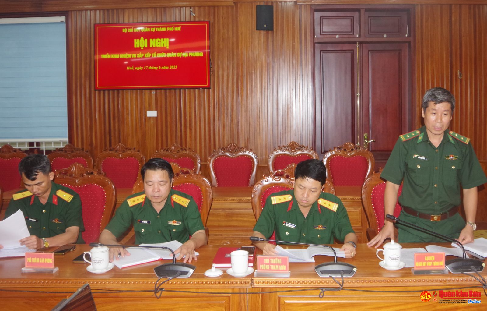 Trên cơ sở chỉ đạo của Bộ Tư lệnh Quân khu, tại hội nghị, Bộ CHQS thành phố Huế đã triển khai nhiệm vụ sắp xếp tổ chức quân sự địa phương; giải thể 9 Ban CHQS cấp huyện, thành lập các đơn vị phòng thủ khu vực; kiện toàn các Ban CHQS cấp xã, đơn vị dân quân tự vệ; tiếp nhận các đơn vị Biên phòng trực thuộc Ban Chỉ huy Bộ đội Biên phòng thành phố.