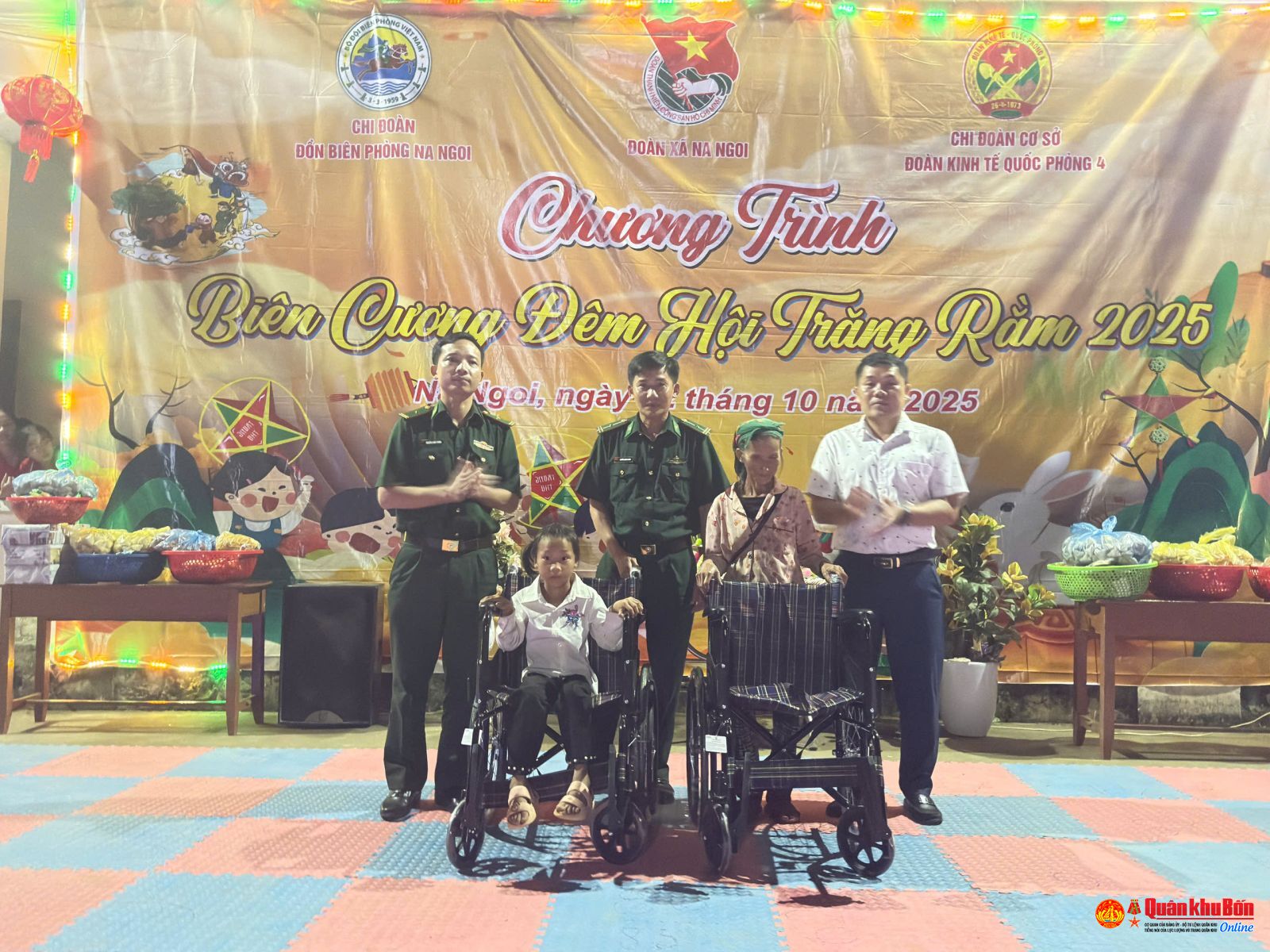 Tại các xã Keng Đu, Mỹ Lý và Ngọc Lâm, không khí Trung thu càng thêm rộn ràng, ấm áp. Đồn Biên phòng Keng Đu phối hợp với chính quyền và nhà trường tổ chức chương trình “Biên cương – Đêm hội trăng rằm” cho thiếu nhi toàn xã; Đồn Biên phòng Mỹ Lý phối hợp với các nhà tài trợ trao 10 xe đạp cho học sinh nghèo vượt khó và con nuôi đồn Biên phòng; Đồn Biên phòng Ngọc Lâm chuẩn bị mâm cỗ Trung thu chu đáo, tổ chức cho các em thiếu nhi vui phá cỗ, rước đèn trong không khí đầm ấm, nghĩa tình. Đặc biệt, Đồn Biên phòng Na Ngoi đã trao tặng xe lăn cho các em nhỏ bị khuyết tật, thể hiện tinh thần sẻ chia, nhân ái của người lính quân hàm xanh nơi biên cương Tổ quốc.