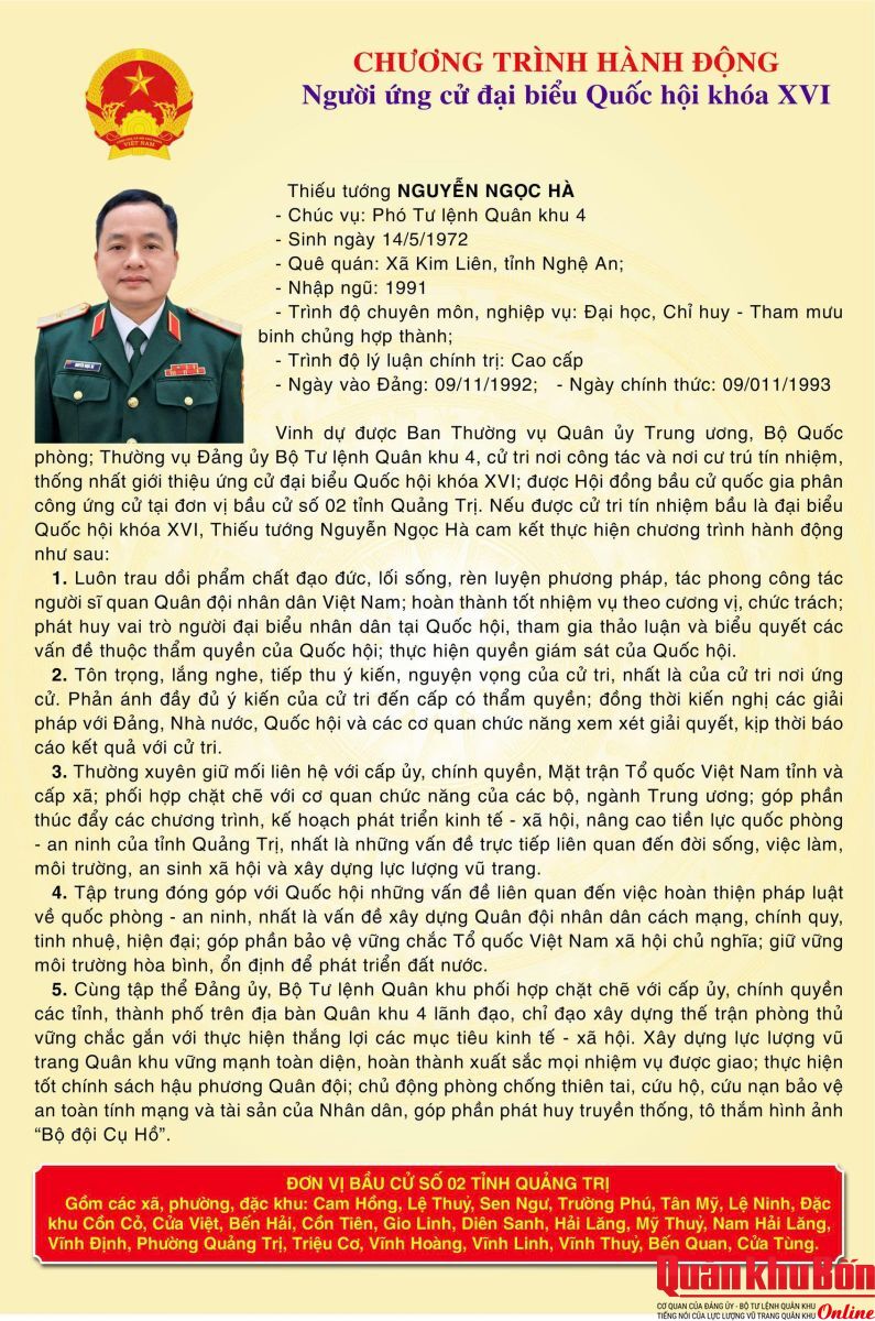 Vinh dự được Ban Thường vụ Quân ủy Trung ương, Bộ Quốc phòng; Thường vụ Đảng ủy Bộ Tư lệnh Quân khu 4, cử tri nơi công tác và nơi cư trú tín nhiệm, thống nhất giới thiệu ứng cử đại biểu Quốc hội khóa XVI; được Hội đồng bầu cử quốc gia phân công ứng cử tại đơn vị bầu cử số 02 tỉnh Quảng Trị. Nếu được cử tri tín nhiệm bầu là đại biểu Quốc hội khóa XVI, Thiếu tướng Nguyễn Ngọc Hà cam kết thực hiện chương trình hành động như sau: