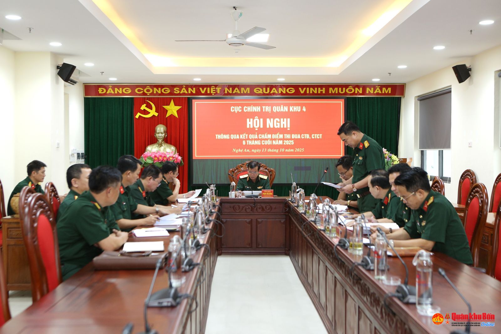 Chiều 13/10/2025, Cục Chính trị Quân khu 4 tổ chức Hội nghị thông qua kết quả chấm điểm thi đua công tác Đảng, công tác chính trị 6 tháng cuối năm 2025. Thiếu tướng Phạm Văn Đông, Ủy viên Ban Thường vụ Đảng ủy, Chủ nhiệm Chính trị Quân khu chủ trì Hội nghị. Thiếu tướng Phan Văn Sỹ, Bí thư Đảng ủy Cục Chính trị, Phó Chủ nhiệm Chính trị Quân khu dự Hội nghị.