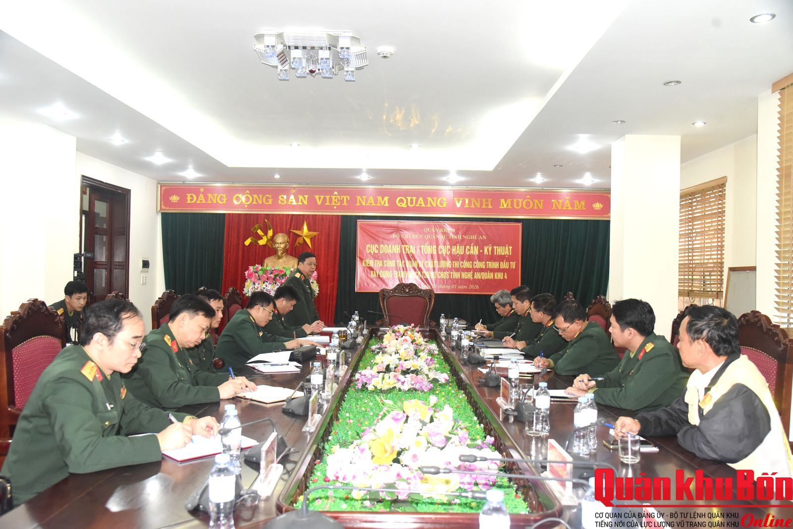 Sáng 22/01/2026, đoàn công tác Cục Doanh trại (Tổng cục Hậu cần - Kỹ thuật) do Đại tá Trần Dương Phúc, Phó cục trưởng Cục Doanh trại làm trưởng đoàn đã kiểm tra công tác quản lý chất lượng thi công công trình đầu tư xây dựng Trạm khách T20 thuộc Bộ Chỉ huy Quân sự tỉnh Nghệ An. Tham gia đoàn công tác có Thiếu tướng Ngô Nam Cường, Phó Tư lệnh Quân khu 4; Đại tá Phạm Đức Tuấn, Chủ nhiệm Hậu cần - Kỹ thuật Quân khu 4; thủ trưởng, cán bộ Phòng Quản lý chất lượng (Cục Doanh trại) và đại diện Phòng Doanh trại Quân khu 4. Tiếp và làm việc với đoàn có đại diện Bộ Chỉ huy Quân sự tỉnh Nghệ An (chủ đầu tư) và các nhà thầu tham gia dự án.
