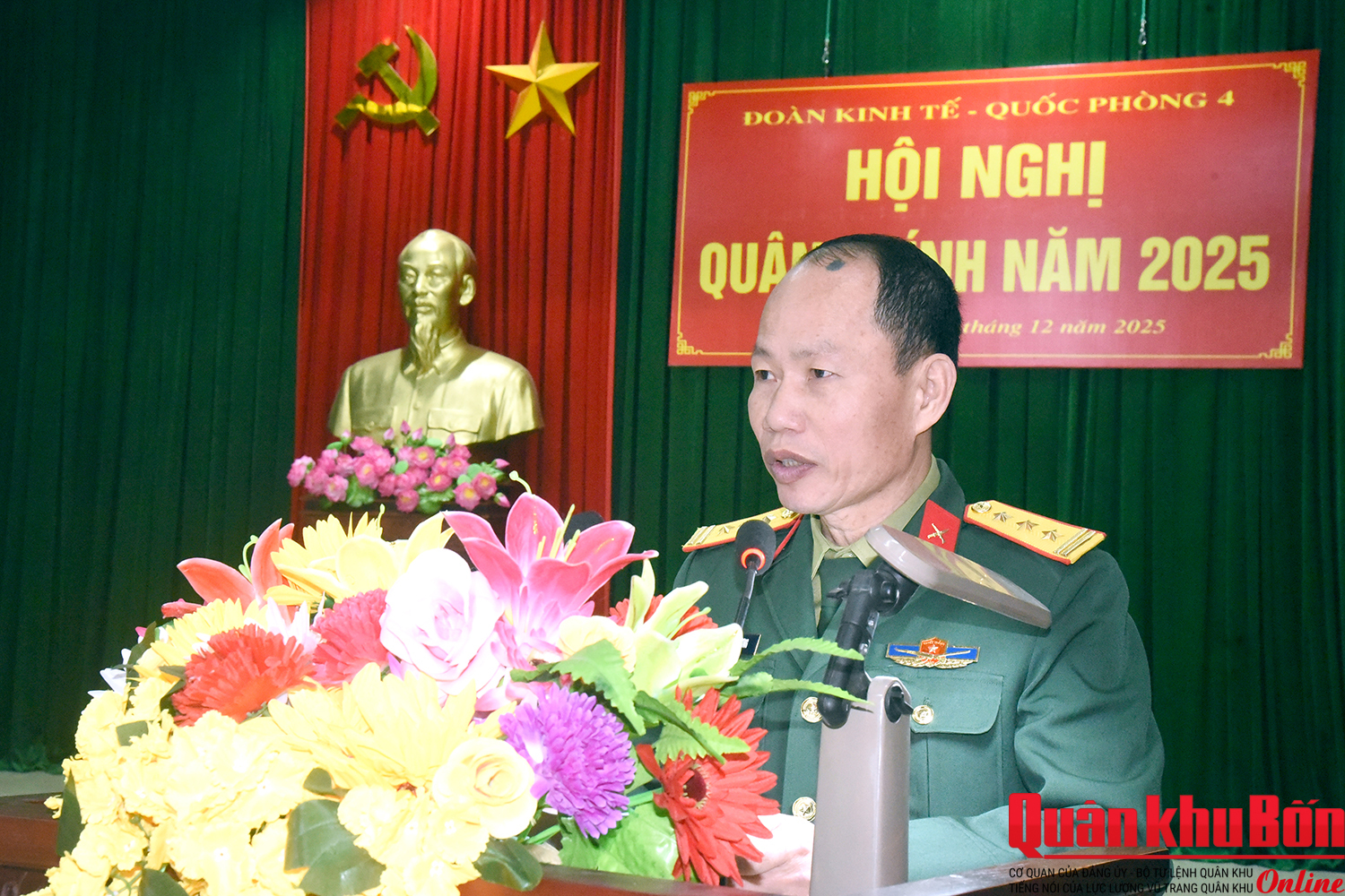 Phát biểu chỉ đạo Hội nghị, Đại tá Ngô Nam Cường, Phó Tư lệnh Quân khu ghi nhận, biểu dương những kết quả đạt được của Đoàn Kinh tế - Quốc phòng 4 trong năm 2025. Đồng chí Phó Tư lệnh Quân khu yêu cầu, năm 2026, Đảng ủy, chỉ huy Đoàn tiếp tục quan tâm làm tốt công tác tuyên truyền, nâng cao nhận thức cho cán bộ, nhân viên, chiến sĩ, trí thức trẻ tình nguyện trong đơn vị và bà con Nhân dân trên địa bàn. Nắm chắc tình hình địa bàn, nhất là an ninh tôn giáo. Tập trung lãnh đạo nâng cao năng lực lãnh đạo, sức chiến đấu toàn diện của cấp ủy Đảng các cấp trong Đảng bộ Đoàn. Nâng cao hiệu quả hoạt động của các mô hình; giao chỉ tiêu cụ thể cho từng cá nhân, tập thể trong thực hiện các đề án. Tiếp tục bảo đảm tốt công tác hậu cần, tài chính trong các nhiệm vụ; bảo đảm an toàn trong các hoạt động và an toàn giao thông.
