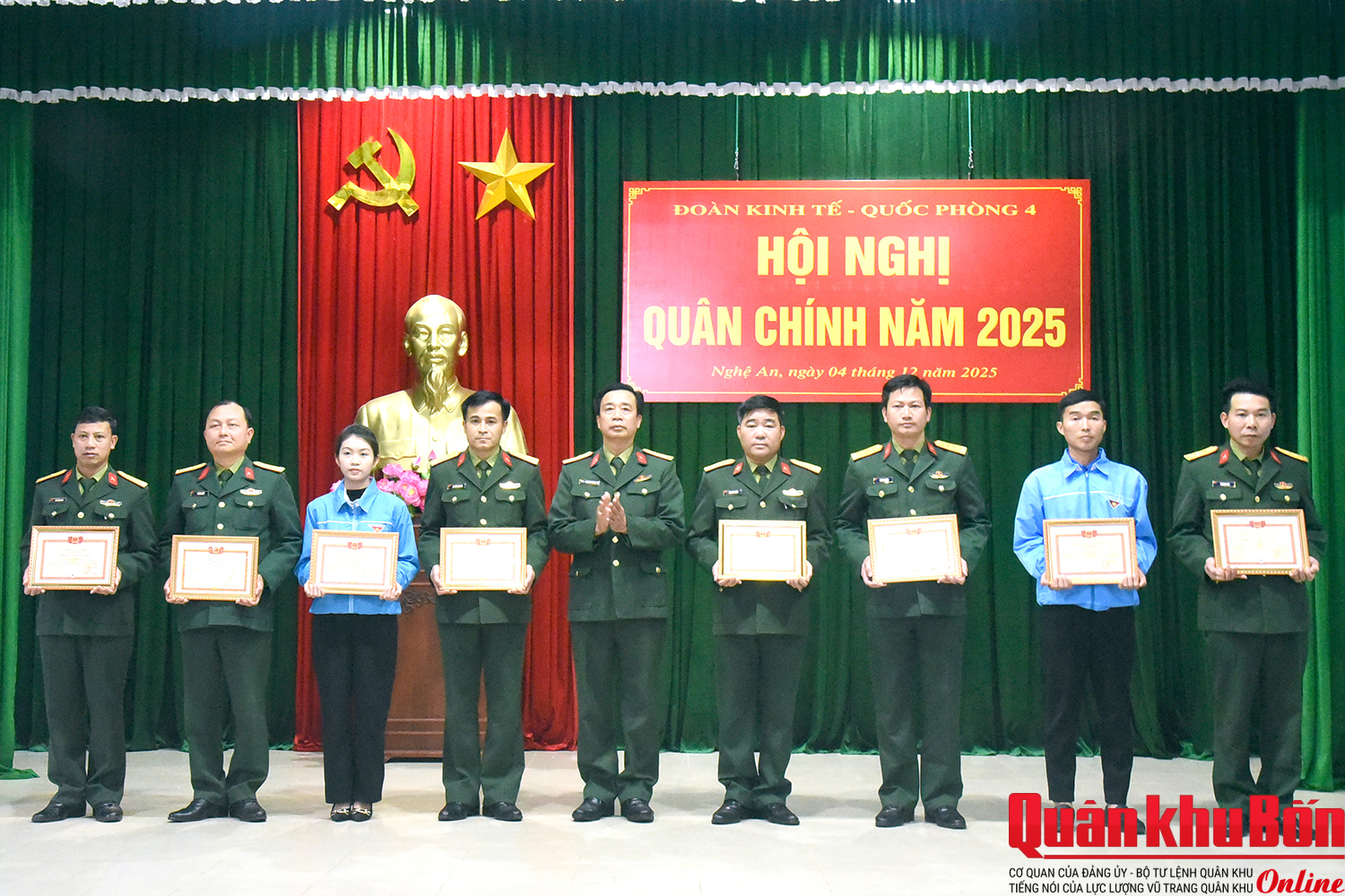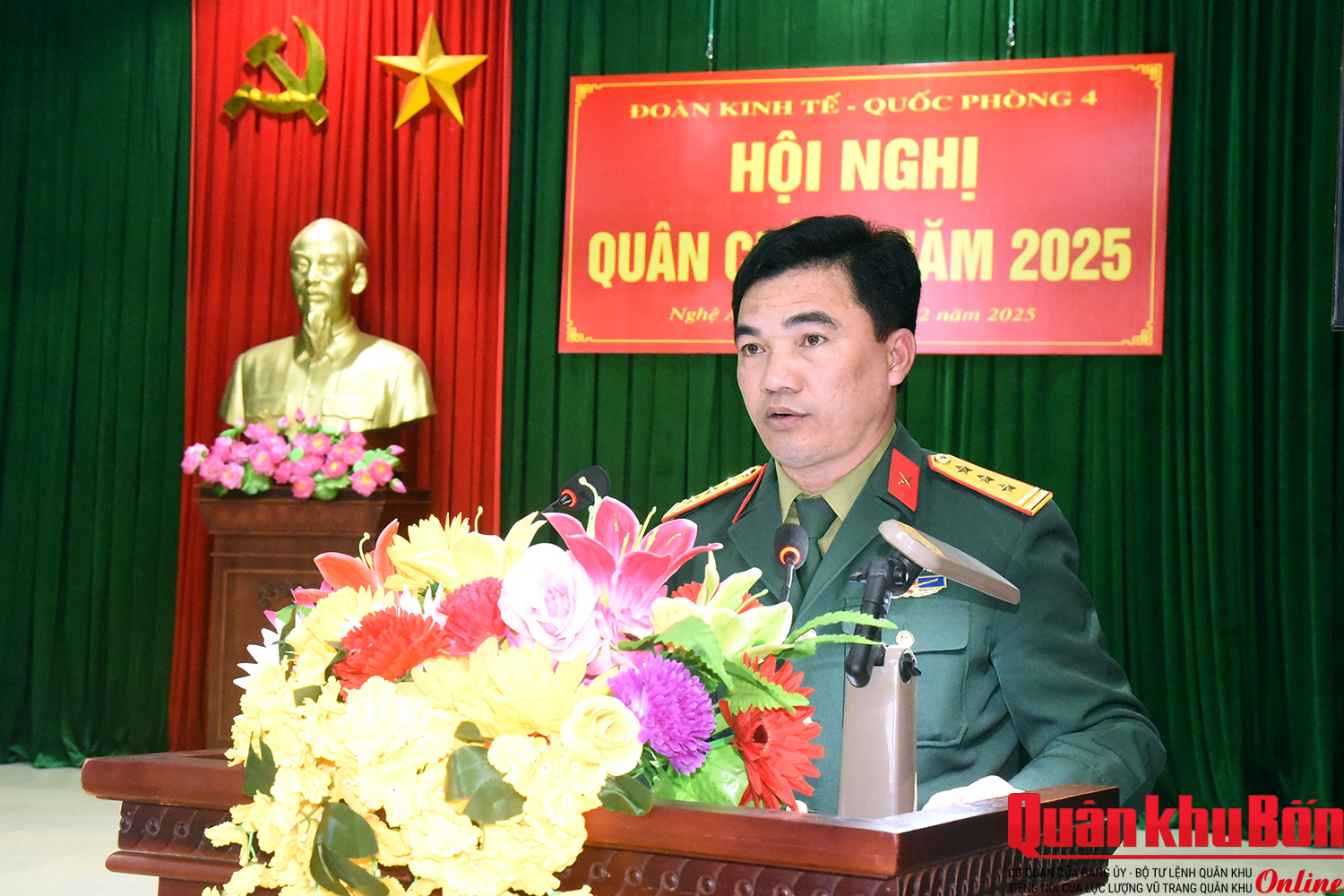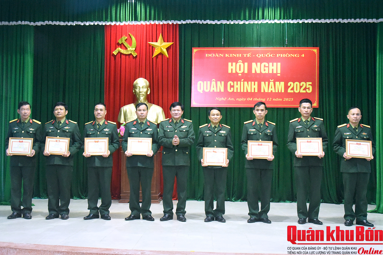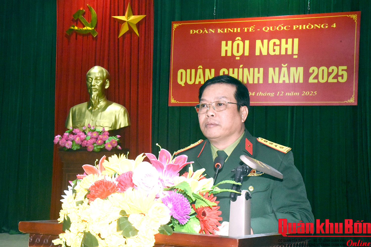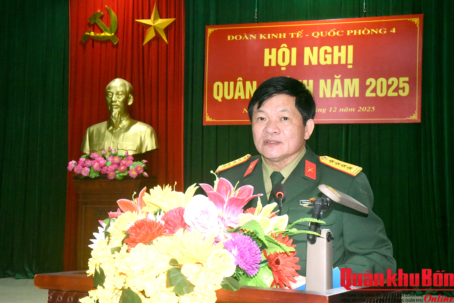 Ngày 4/12/2025, Đoàn Kinh tế - Quốc phòng 4 (Quân khu 4) tổ chức Hội nghị Quân chính năm 2025 đánh giá kết quả năm 2025, triển khai nhiệm vụ năm 2026. Đại tá Ngô Nam Cường, Phó Tư lệnh Quân khu dự, chỉ đạo Hội nghị. Tham dự Hội nghị có Đại tá Nguyễn Kỳ Hồng, Phó Chủ nhiệm Chính trị Quân khu; Thượng tá Hoàng Ngọc Lượng, Phó trưởng phòng Quân nhu (Cục Hậu cần - Kỹ thuật); cán bộ Phòng Tổ chức (Cục Chính trị), Văn phòng Quân khu. Đại tá Lê Văn Thắng, Đoàn trưởng Đoàn Kinh tế - Quốc phòng 4 chủ trì Hội nghị.