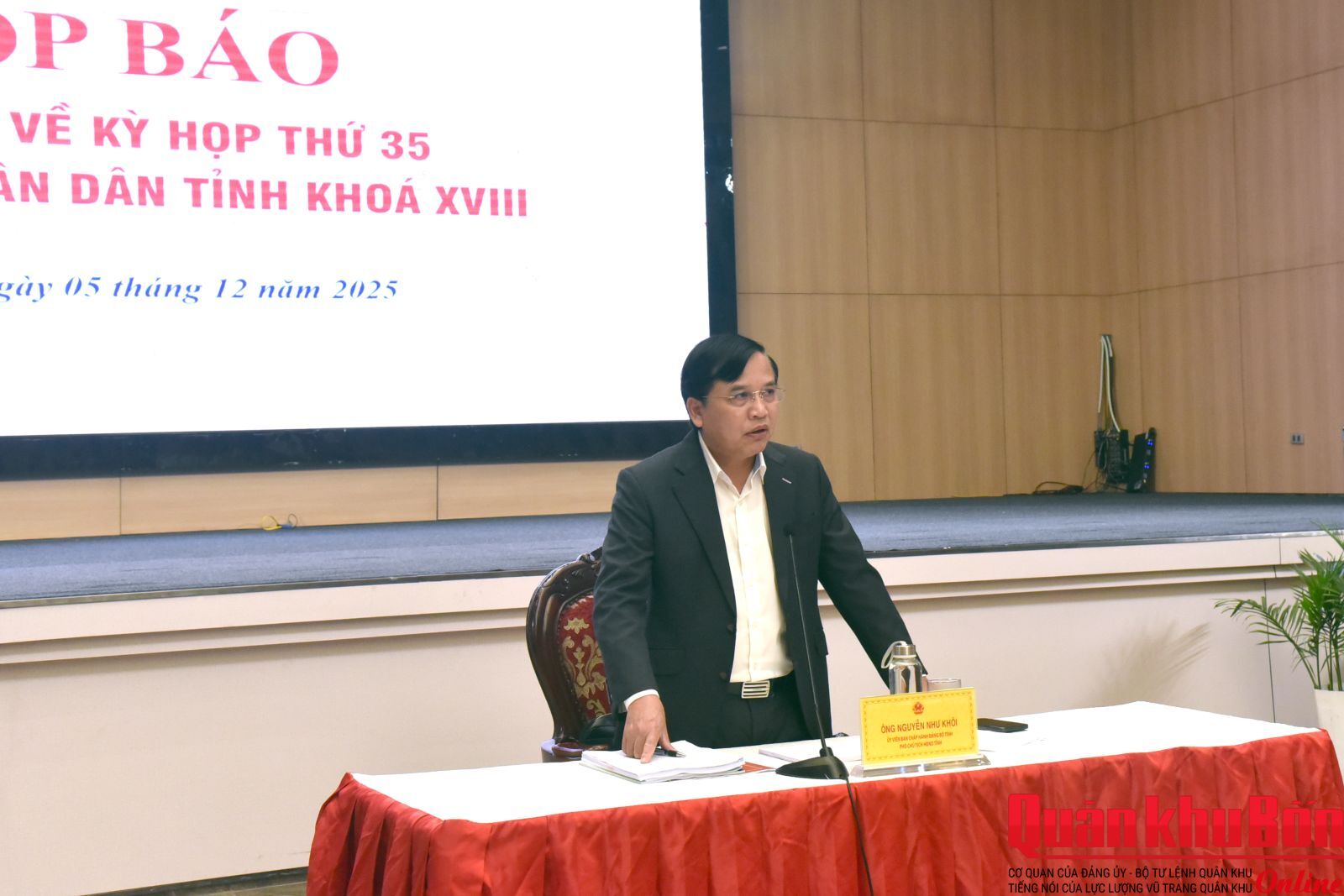 Chiều 5/12/2025, Thường trực Hội đồng nhân dân tỉnh Nghệ An tổ chức họp báo công bố về Kỳ họp thứ 35, Hội đồng nhân dân tỉnh khóa XVIII, nhiệm kỳ 2021 - 2026. Đồng chí Nguyễn Như Khôi, Ủy viên Ban Chấp hành Đảng bộ tỉnh, Phó Chủ tịch Hội đồng nhân dân tỉnh chủ trì. Tham dự có đại diện lãnh đạo một số sở, ngành cùng các cơ quan thông tấn, báo chí trên địa bàn.