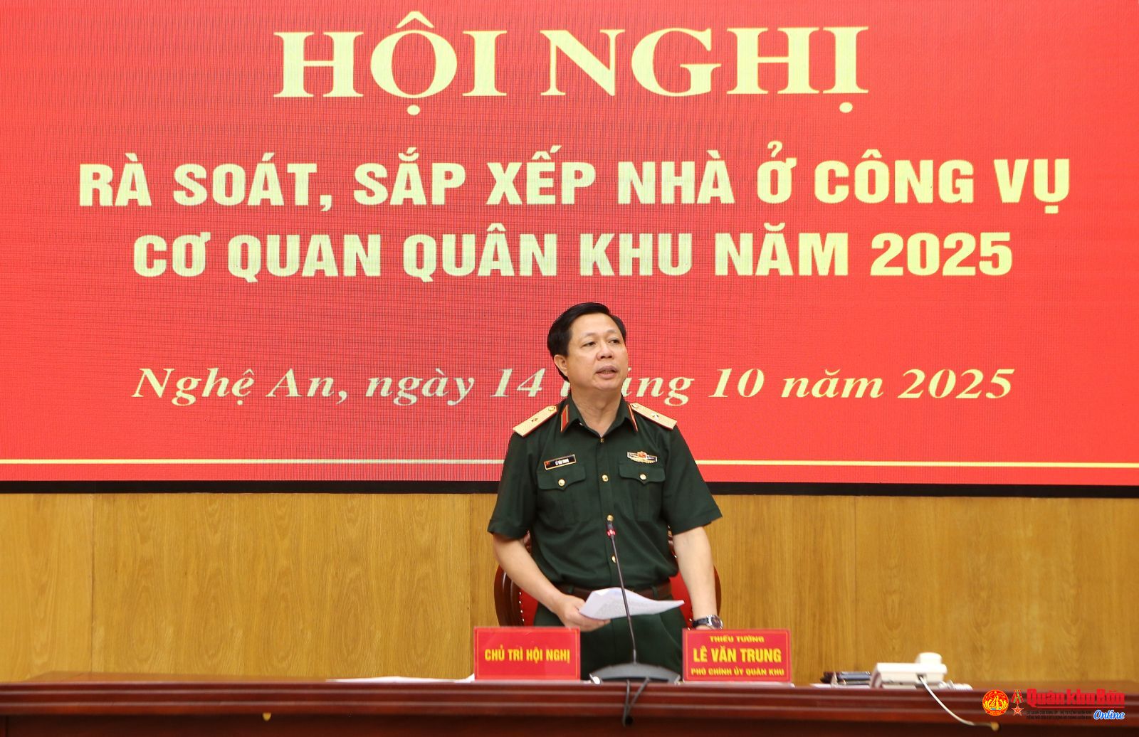 Sáng 14/10/2025, Ban Chỉ đạo Chính sách đất ở, nhà ở Quân khu 4 tổ chức Hội nghị rà soát, sắp xếp nhà ở công vụ cơ quan Quân khu năm 2025. Thiếu tướng Lê Văn Trung, Ủy viên Ban Thường vụ Đảng ủy, Phó Chính ủy Quân khu, Trưởng Ban Chỉ đạo chủ trì Hội nghị.