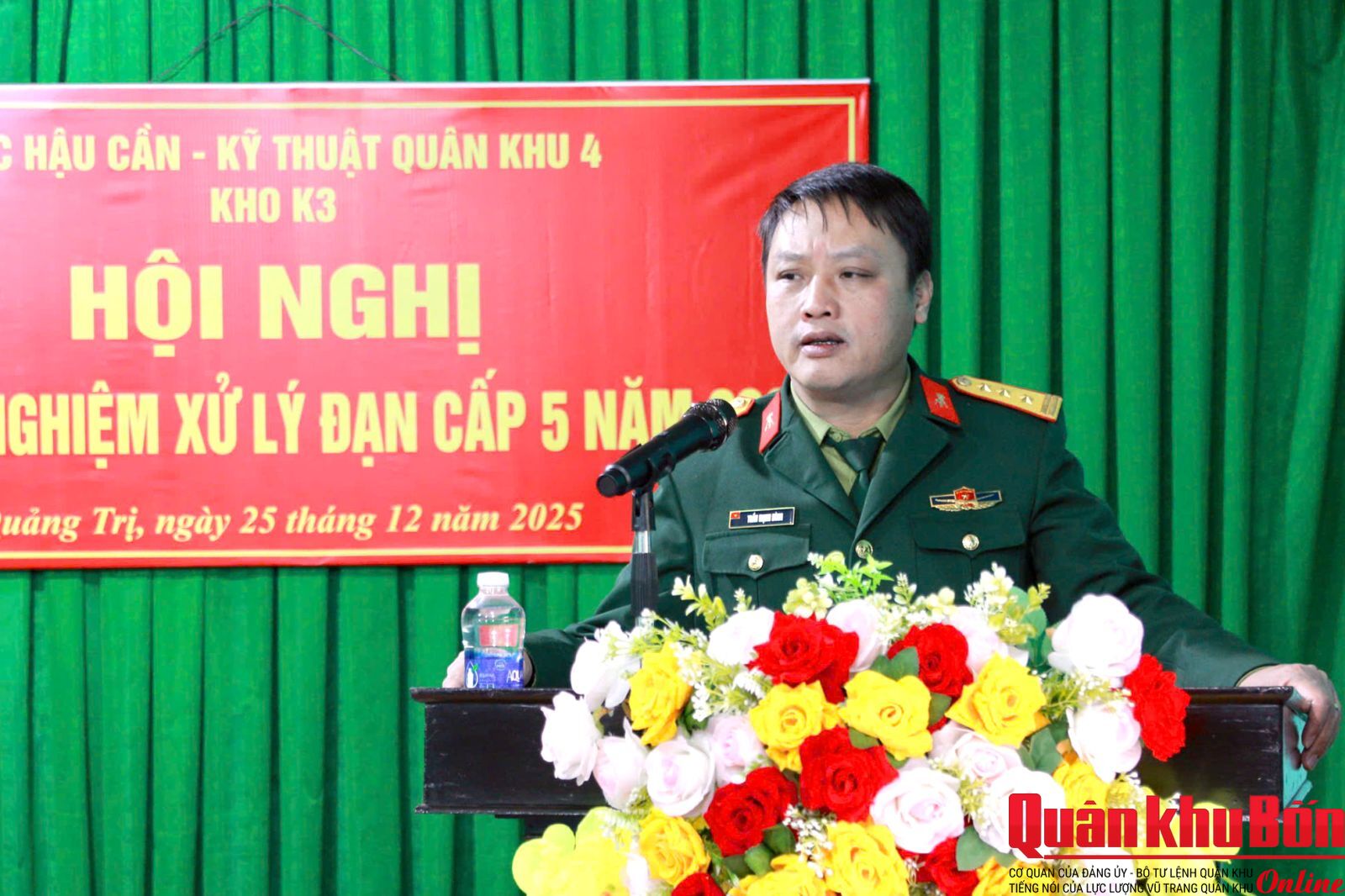 Chiều 25/12/2025, Kho K3 (Cục Hậu cần - Kỹ thuật Quân khu 4) tổ chức Hội nghị rút kinh nghiệm công tác xử lý đạn cấp 5 năm 2025. Thượng tá Trần Mạnh Hùng, Chủ nhiệm Kho chủ trì hội nghị. Tham dự có đại diện chỉ huy các cơ quan, đơn vị và các đồng chí trong đội xử lý đạn của Kho.