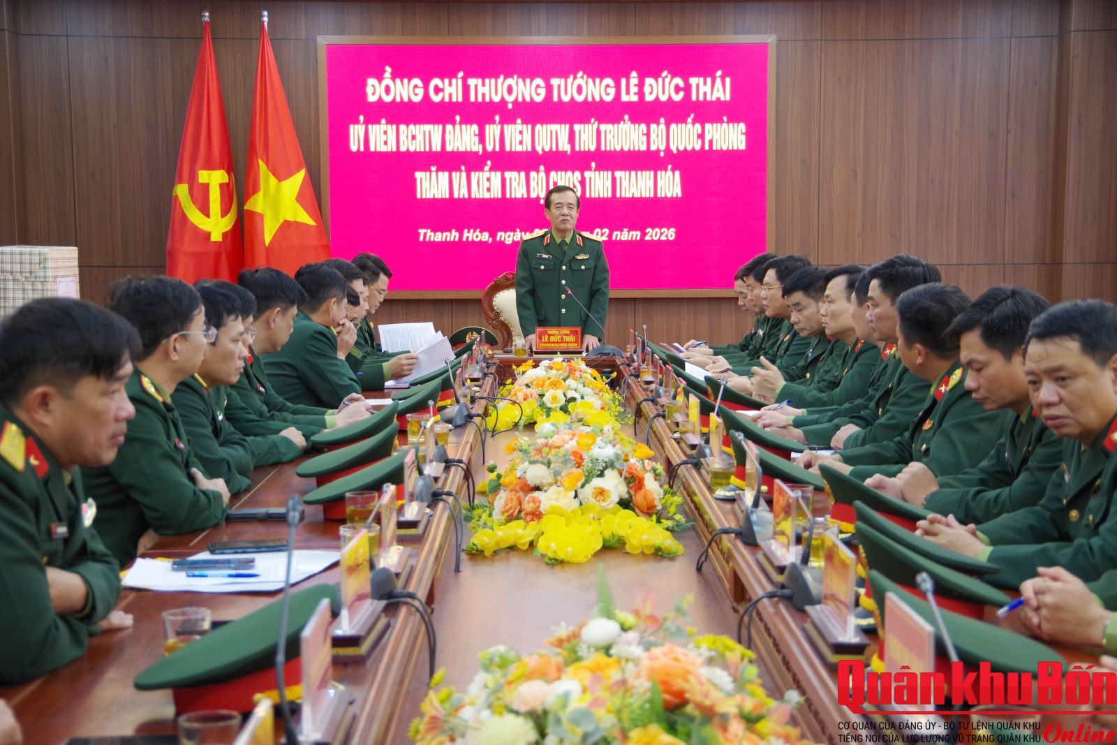 Chiều 25/2/2026, đoàn công tác Bộ Quốc phòng do Thượng tướng Lê Đức Thái, Ủy viên Trung ương Đảng, Ủy viên Quân ủy Trung ương, Thứ trưởng Bộ Quốc phòng làm trưởng đoàn đã đến thăm, kiểm tra, nắm tình hình tại Bộ Chỉ huy Quân sự (CHQS) tỉnh Thanh Hóa.