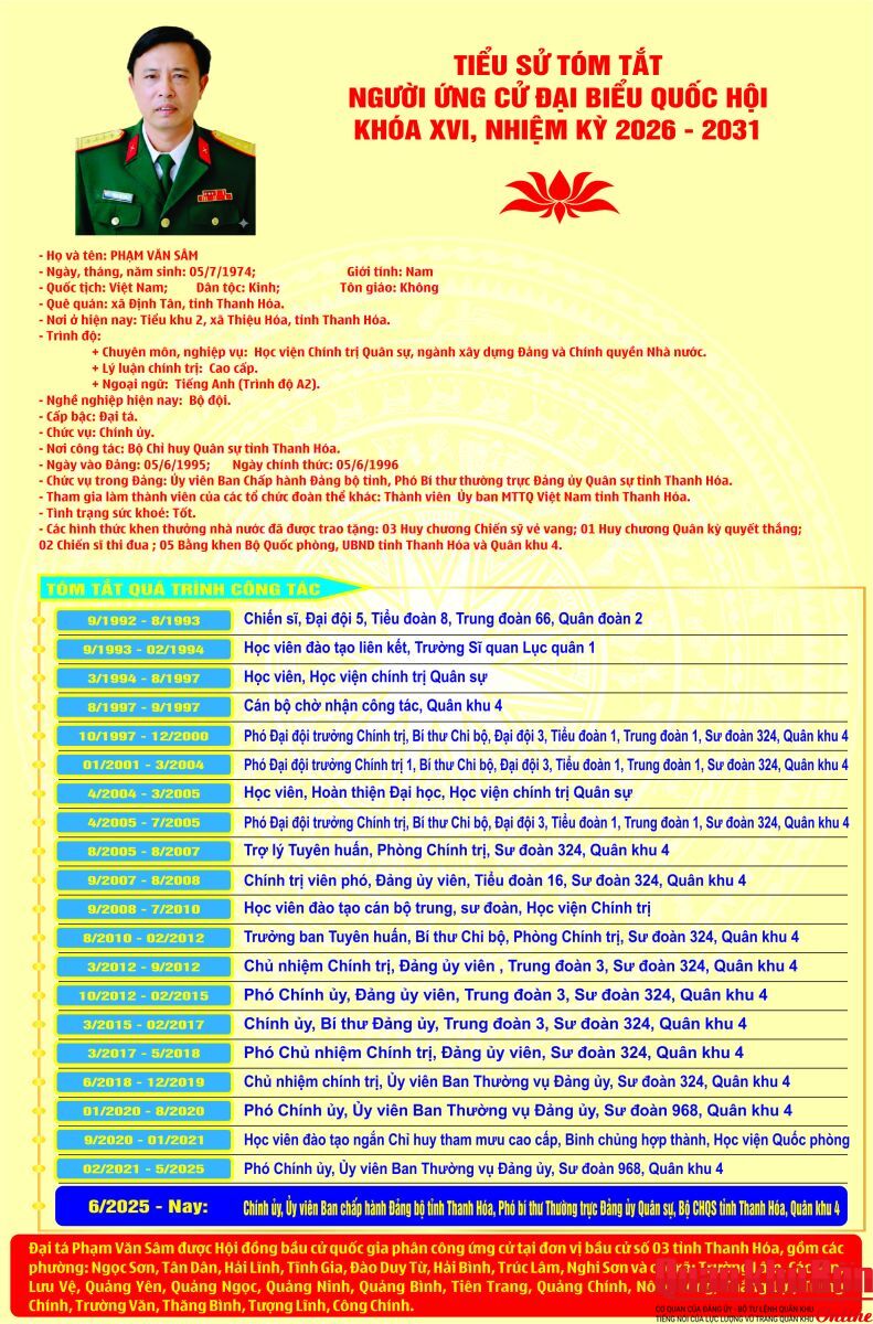 Đại tá Phạm Văn Sâm, Ủy viên Ban chấp hành Đảng bộ tỉnh Thanh Hóa, Phó bí thư Thường trực Đảng ủy Quân sự tỉnh, Chính ủy Bộ CHQS tỉnh Thanh Hóa được Hội đồng bầu cử quốc gia phân công ứng cử tại đơn vị bầu cử số 03 tỉnh Thanh Hóa, gồm các phường: Ngọc Sơn, Tân Dân, Hải Lĩnh, Tĩnh Gia, Đào Duy Từ, Hải Bình, Trúc Lâm, Nghi Sơn và các xã: Trường Lâm, Các Sơn, Lưu Vệ, Quảng Yên, Quảng Ngọc, Quảng Ninh, Quảng Bình, Tiên Trang, Quảng Chính, Nông Cống, Thắng Lợi, Trung Chính, Trường Văn, Thăng Bình, Tượng Lĩnh, Công Chính.