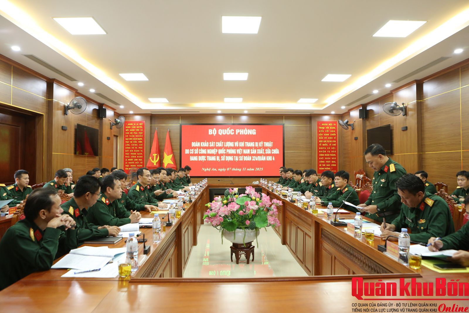 Sáng 7/11/2025, đoàn công tác Tổng cục Công nghiệp Quốc phòng do Thiếu tướng Dương Văn Yên, Phó Chủ nhiệm Tổng cục Công nghiệp Quốc phòng làm trưởng đoàn tiến hành khảo sát chất lượng vũ khí trang bị kỹ thuật (VKTBKT) do cơ sở Công nghiệp Quốc phòng (CNQP) Việt Nam sản xuất, sửa chữa đang được trang bị, sử dụng tại Sư đoàn 324 (Quân khu 4). Thiếu tướng Hoàng Duy Chiến, Phó Tư lệnh Quân khu 4; Đại tá Nguyễn Huy Việt, Phó Chủ nhiệm Hậu cần - Kỹ thuật Quân khu 4 tham gia đoàn khảo sát.