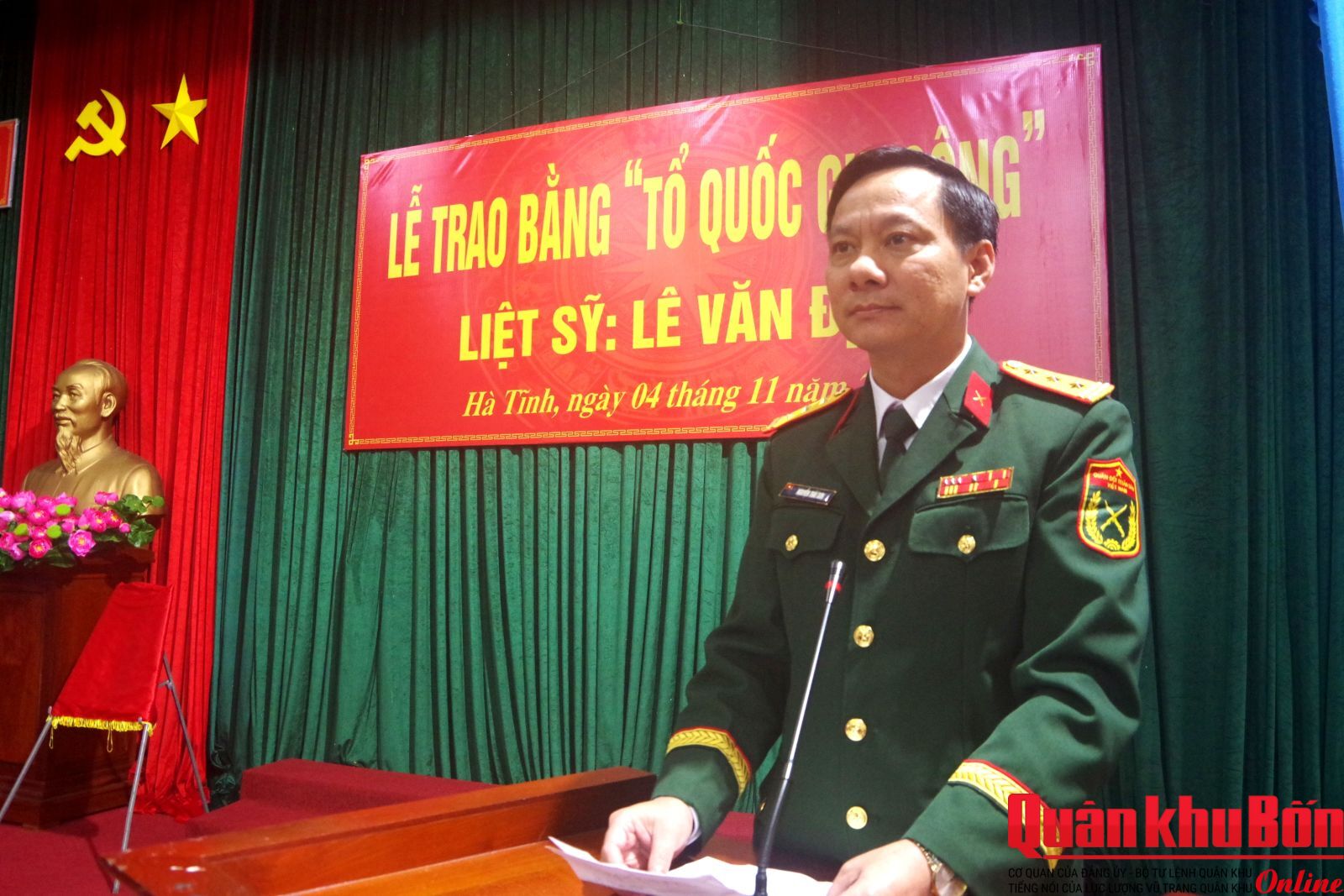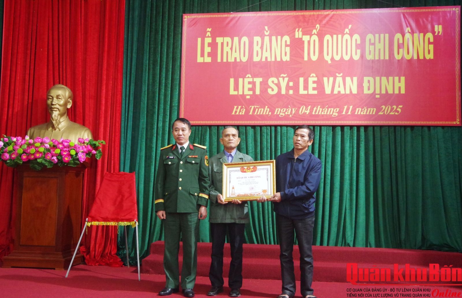 Tại buổi lễ, Đại tá Mai Ngọc Việt, Phó Chính ủy Bộ CHQS tỉnh Hà Tĩnh, đã trao Bằng “Tổ quốc ghi công” cho thân nhân liệt sĩ Lê Văn Định; đồng thời bày tỏ lòng tri ân sâu sắc trước sự hi sinh anh dũng của liệt sĩ vì độc lập, tự do của dân tộc. Đồng chí mong muốn gia đình tiếp tục phát huy truyền thống cách mạng, nêu gương sáng trong xây dựng quê hương ngày càng giàu đẹp, văn minh.