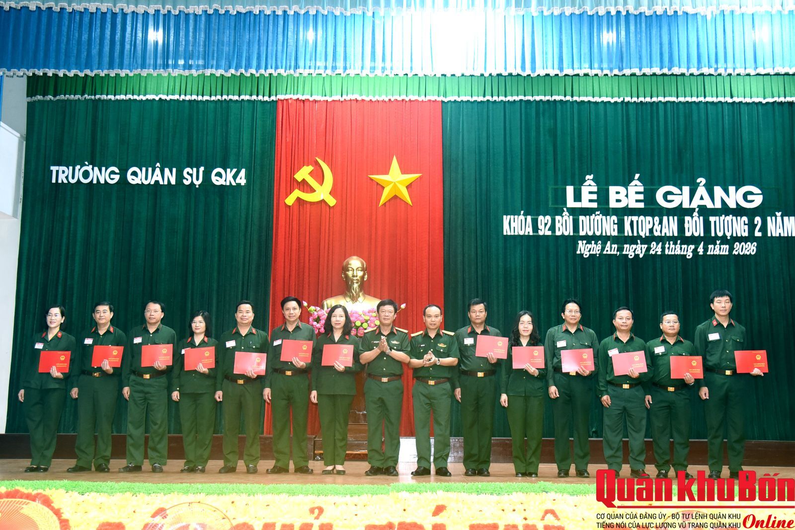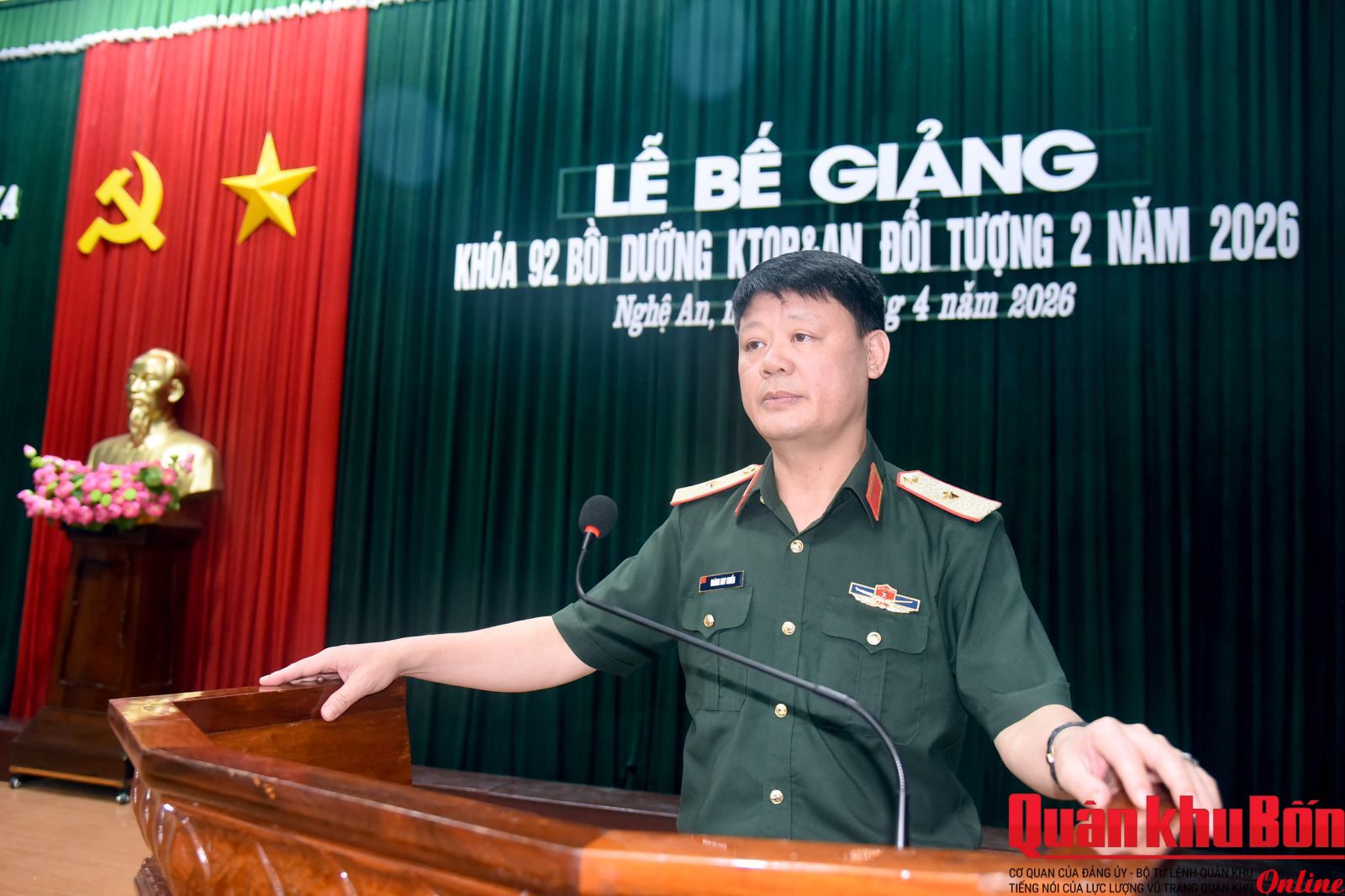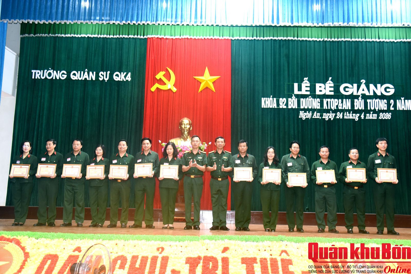 Sáng 24/4/2026, Trường Quân sự Quân khu 4 tổ chức Lễ bế giảng Khóa 92 bồi dưỡng kiến thức quốc phòng và an ninh đối tượng 2 năm 2026. Thiếu tướng Hoàng Duy Chiến, Phó Tư lệnh, Phó Chủ tịch Hội đồng Giáo dục quốc phòng và an ninh Quân khu dự, phát biểu chỉ đạo.