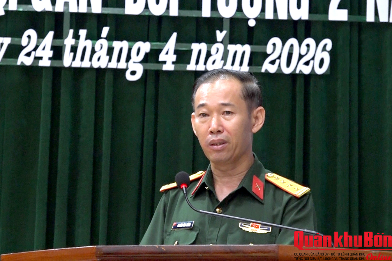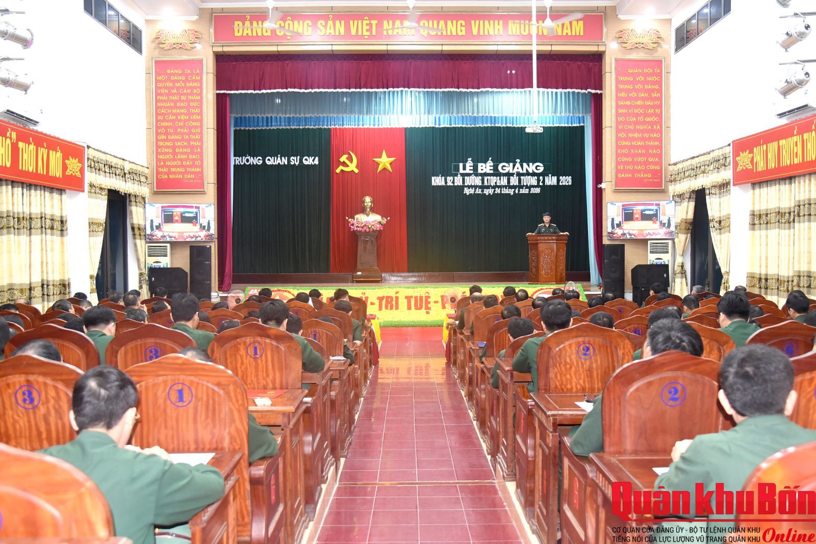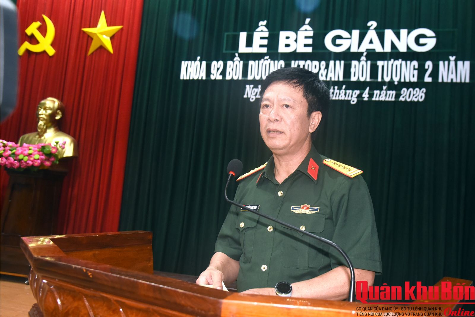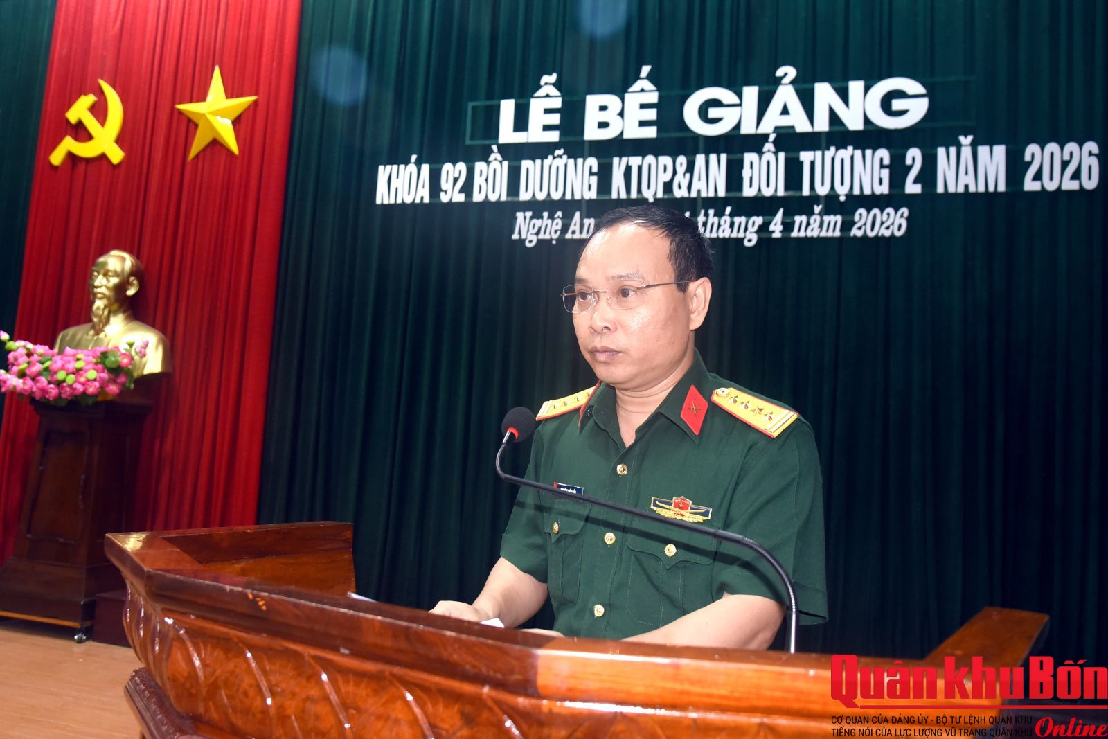 Sáng 24/4/2026, Trường Quân sự Quân khu 4 tổ chức Lễ bế giảng Khóa 92 bồi dưỡng kiến thức quốc phòng và an ninh đối tượng 2 năm 2026. Thiếu tướng Hoàng Duy Chiến, Phó Tư lệnh, Phó Chủ tịch Hội đồng Giáo dục quốc phòng và an ninh Quân khu dự, phát biểu chỉ đạo.