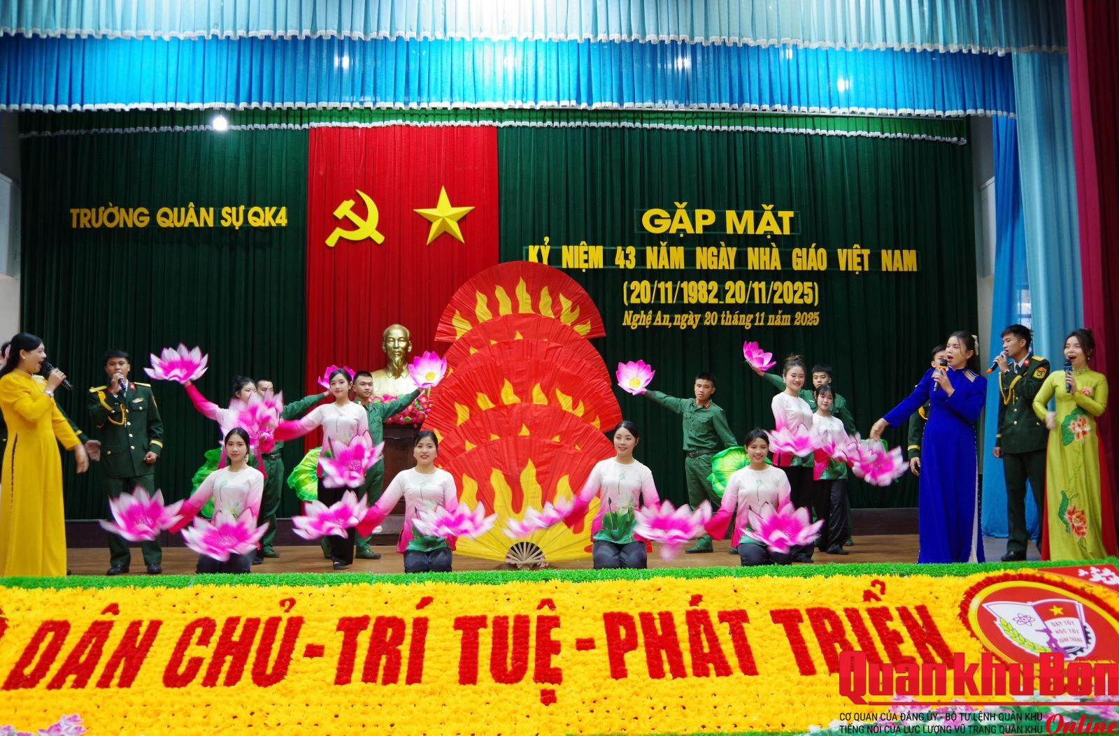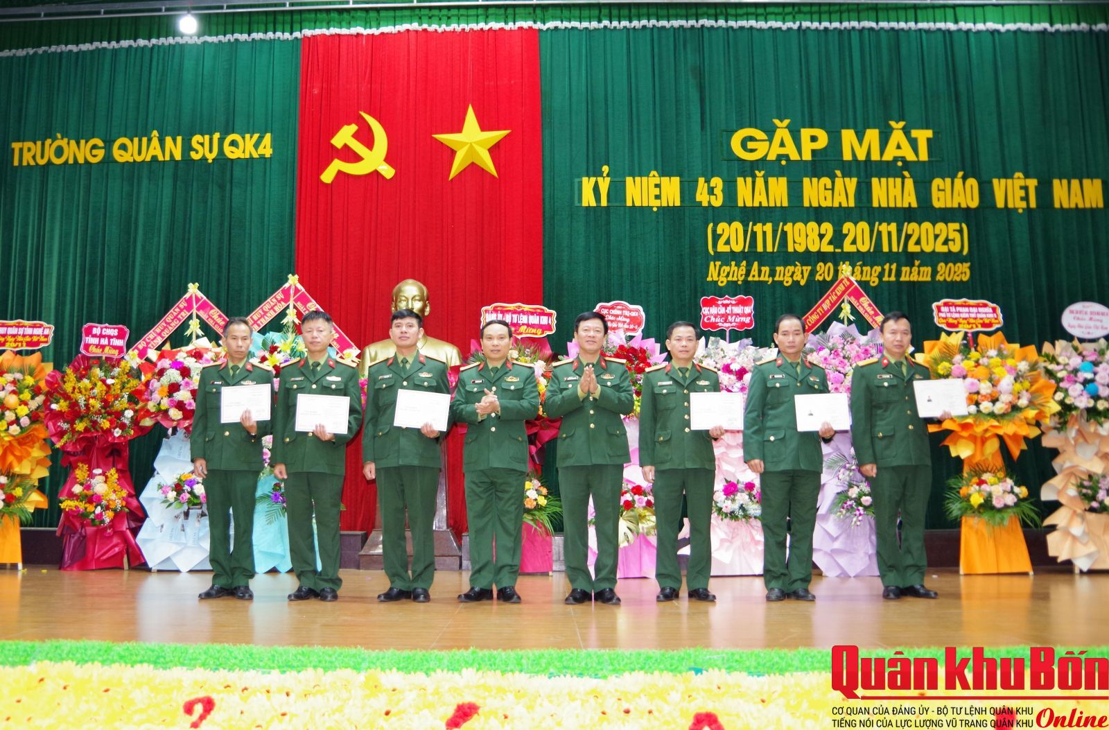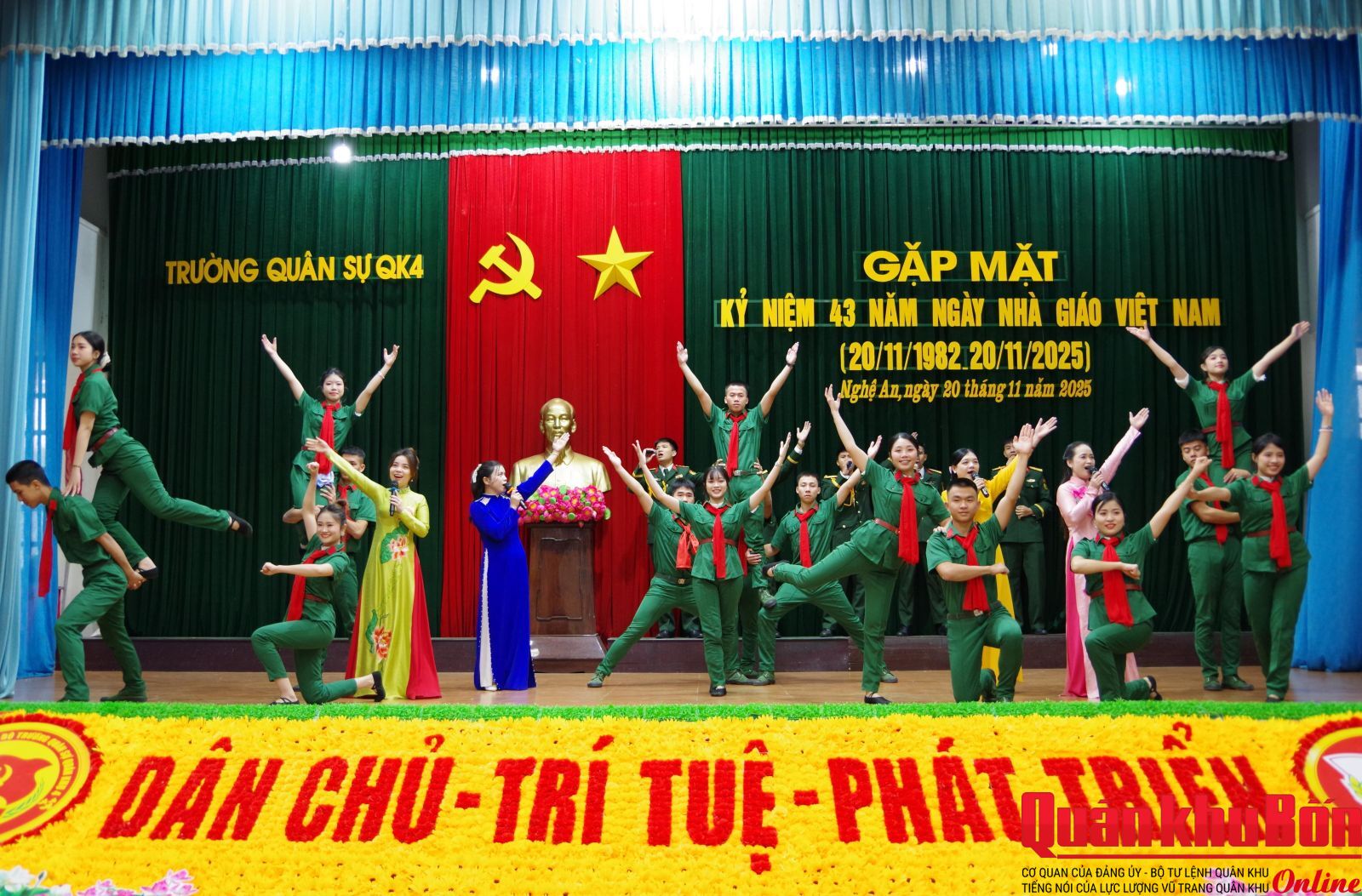 Sáng 20/11/2025, Trường Quân sự Quân khu 4 tổ chức gặp mặt kỷ niệm 43 năm Ngày Nhà giáo Việt Nam (20/11/1982 - 20/11/2025). Dự buổi gặp mặt có Đại tá Nghiêm Việt Đức, Đảng ủy viên Quân khu, Hiệu trưởng Nhà trường; Đại tá Nguyễn Thanh Hùng, Bí thư Đảng ủy, Chính ủy Nhà trường; các đồng chí trong Thường vụ Đảng ủy, Ban Giám hiệu; lãnh đạo, chỉ huy các cơ quan, đơn vị, khoa giáo viên và cán bộ cơ quan, đại diện học viên toàn Trường.