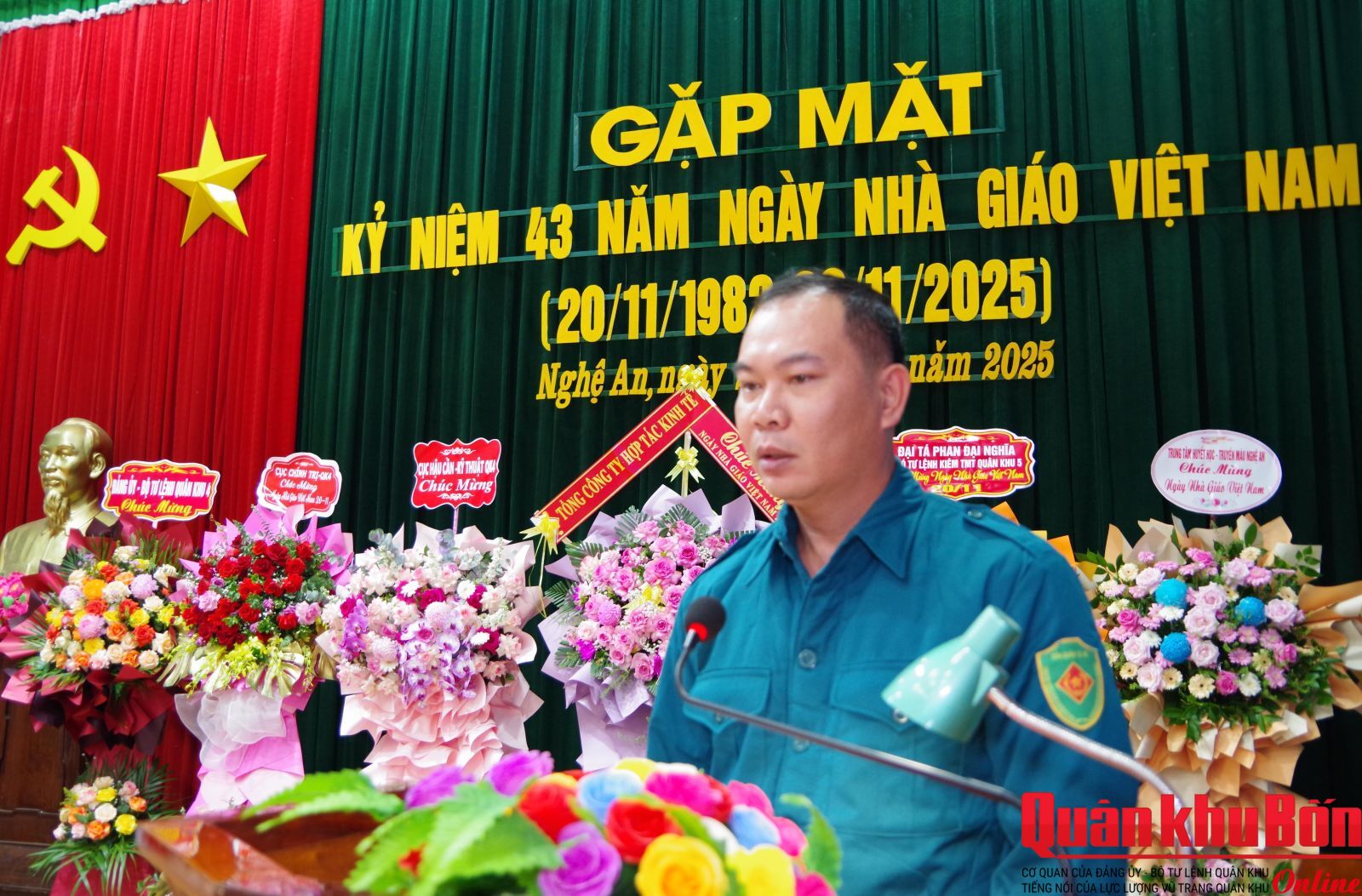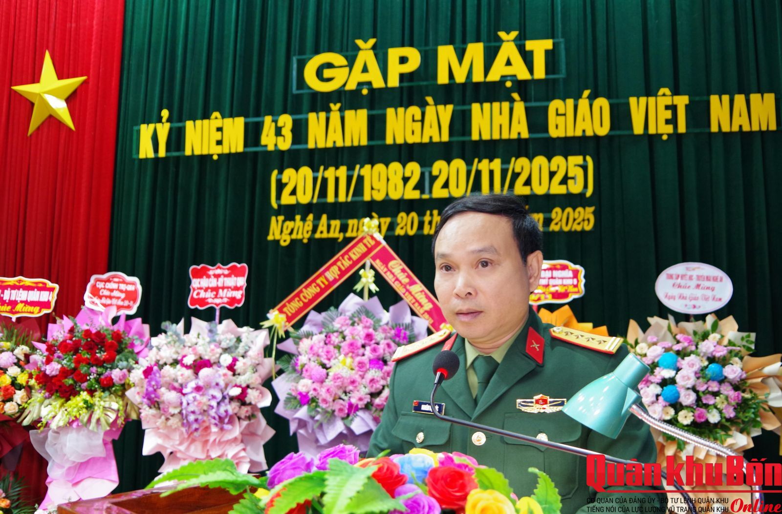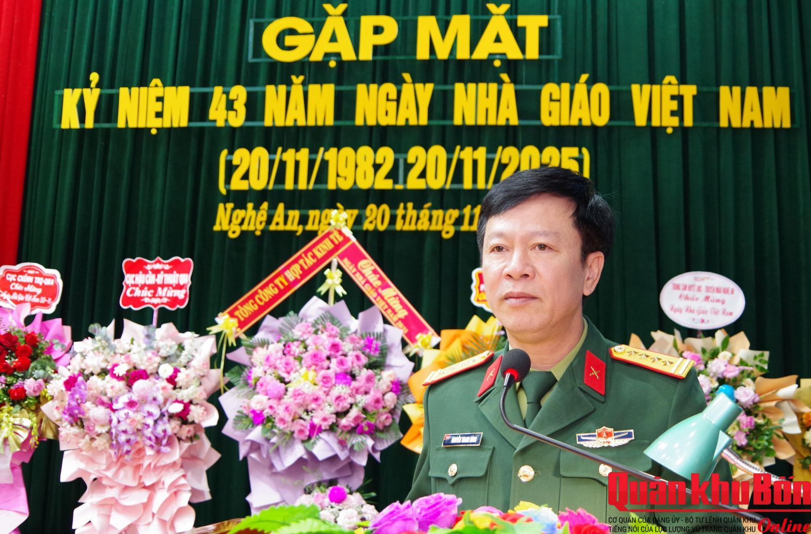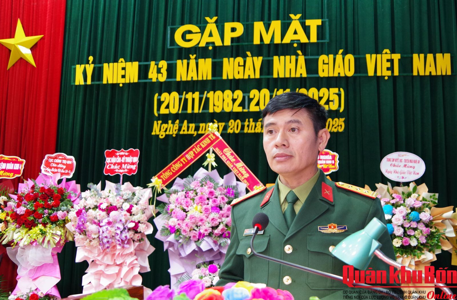 Sáng 20/11/2025, Trường Quân sự Quân khu 4 tổ chức gặp mặt kỷ niệm 43 năm Ngày Nhà giáo Việt Nam (20/11/1982 - 20/11/2025). Dự buổi gặp mặt có Đại tá Nghiêm Việt Đức, Đảng ủy viên Quân khu, Hiệu trưởng Nhà trường; Đại tá Nguyễn Thanh Hùng, Bí thư Đảng ủy, Chính ủy Nhà trường; các đồng chí trong Thường vụ Đảng ủy, Ban Giám hiệu; lãnh đạo, chỉ huy các cơ quan, đơn vị, khoa giáo viên và cán bộ cơ quan, đại diện học viên toàn Trường.