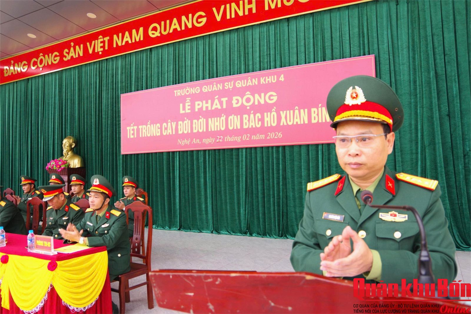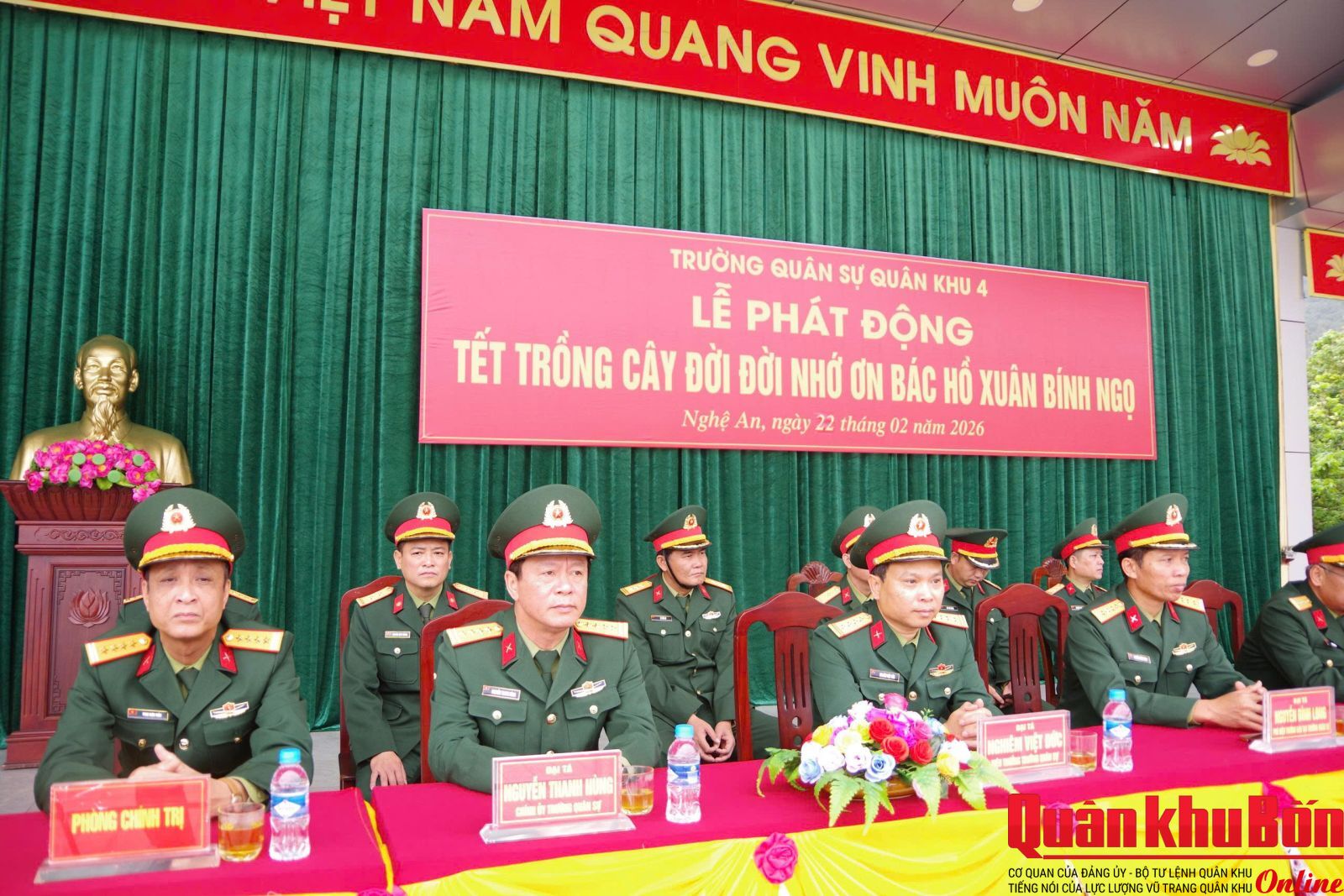 Sáng 22/02/2026, Trường Quân sự Quân khu 4 tổ chức Lễ phát động “Tết trồng cây Xuân Bính Ngọ 2026”. Dự và chỉ đạo buổi lễ có Đại tá Nghiêm Việt Đức, Đảng ủy viên Quân khu, Hiệu trưởng Nhà trường; Đại tá Nguyễn Thanh Hùng, Bí thư Đảng ủy, Chính ủy Nhà trường; cùng các đồng chí trong Thường vụ Đảng ủy, Ban Giám hiệu; lãnh đạo, chỉ huy các cơ quan, khoa giáo viên, đơn vị và đông đảo cán bộ, giáo viên, nhân viên, học viên, hạ sĩ quan, binh sĩ toàn Trường.