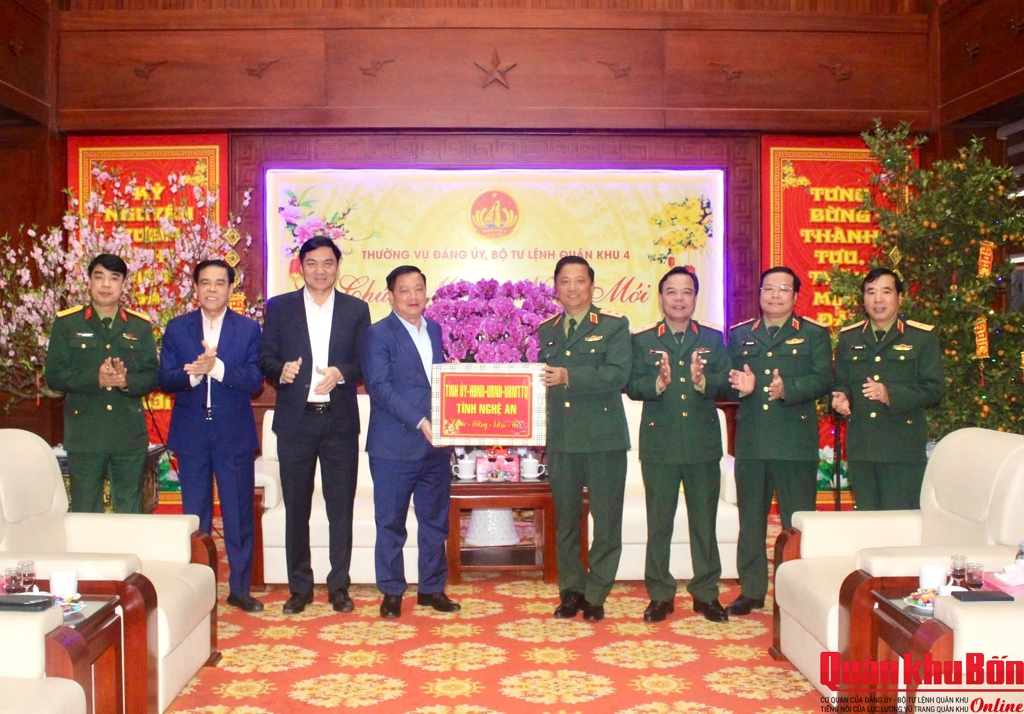 Chiều ngày 9/2/2025, Đoàn công tác của Tỉnh ủy, Hội đồng Nhân dân (HĐND), Ủy ban Nhân dân (UBND) tỉnh Nghệ An do đồng chí Nguyễn Khắc Thận, Bí thư Tỉnh ủy Nghệ An làm trưởng đoàn đã đến thăm, chúc Tết Bộ Tư lệnh Quân khu 4. Tham gia đoàn có các đồng chí: Hoàng Nghĩa Hiếu, Phó Bí thư Thường trực Tỉnh ủy, Chủ tịch HĐND tỉnh; đồng chí Võ Trọng Hải, Phó Bí thư Tỉnh ủy, Chủ tịch UBND tỉnh.