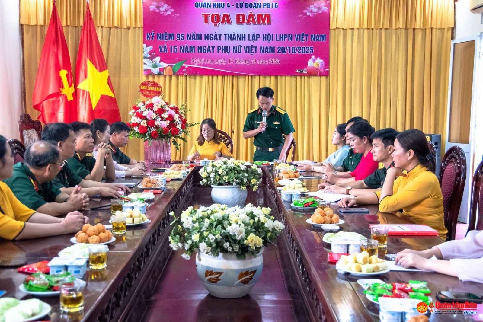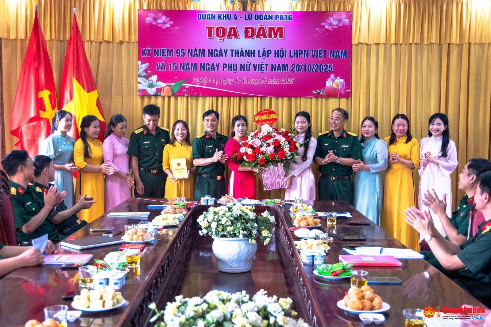 Hướng tới chào mừng kỷ niệm 95 năm Ngày thành lập Hội Liên hiệp Phụ nữ Việt Nam (20/10/1930 - 20/10/2025), sáng ngày 17/10/2025, Lữ đoàn Pháo binh 16 đã tổ chức Tọa đàm truyền thống với chủ đề “Tự hào phụ nữ Việt Nam – Giỏi việc nước, đảm việc nhà”. Đồng chí Đại tá Hoàng Đình Thi, Bí thư Đảng ủy, Chính ủy Lữ đoàn cùng các đồng chí trong Thường vụ Đảng ủy, chỉ huy Lữ đoàn, chỉ huy các cơ quan, đơn vị trực thuộc đến tham dự chung vui với hội viên Phụ nữ Lữ đoàn.