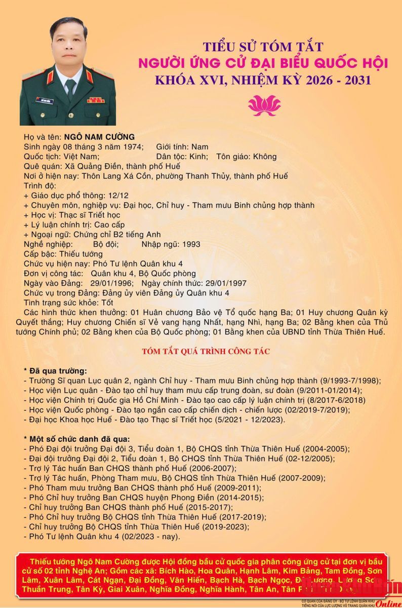 Thiếu tướng Ngô Nam Cường, Phó Tư lệnh Quân khu 4 được Hội đồng bầu cử quốc gia, Ban Thường vụ Quân ủy Trung ương, Bộ Quốc phòng; cử tri nơi công tác và nơi cư trú tín nhiệm, giới thiệu ứng cử đại biểu Quốc hội khóa XVI; được Hội đồng bầu cử quốc gia phân công ứng cử tại đơn vị bầu cử số 02 tỉnh Nghệ An, gồm các xã: Bích Hào, Hoa Quân, Hạnh Lâm, Kim Bảng, Tam Đồng, Sơn Lâm, Xuân Lâm, Cát Ngạn, Đại Đồng, Văn Hiến, Bạch Hà, Bạch Ngọc, Đô Lương, Lương Sơn, Thuần Trung, Tân Kỳ, Giai Xuân, Nghĩa Đồng, Nghĩa Hành, Tân An, Tân Phú, Tiên Đồng.