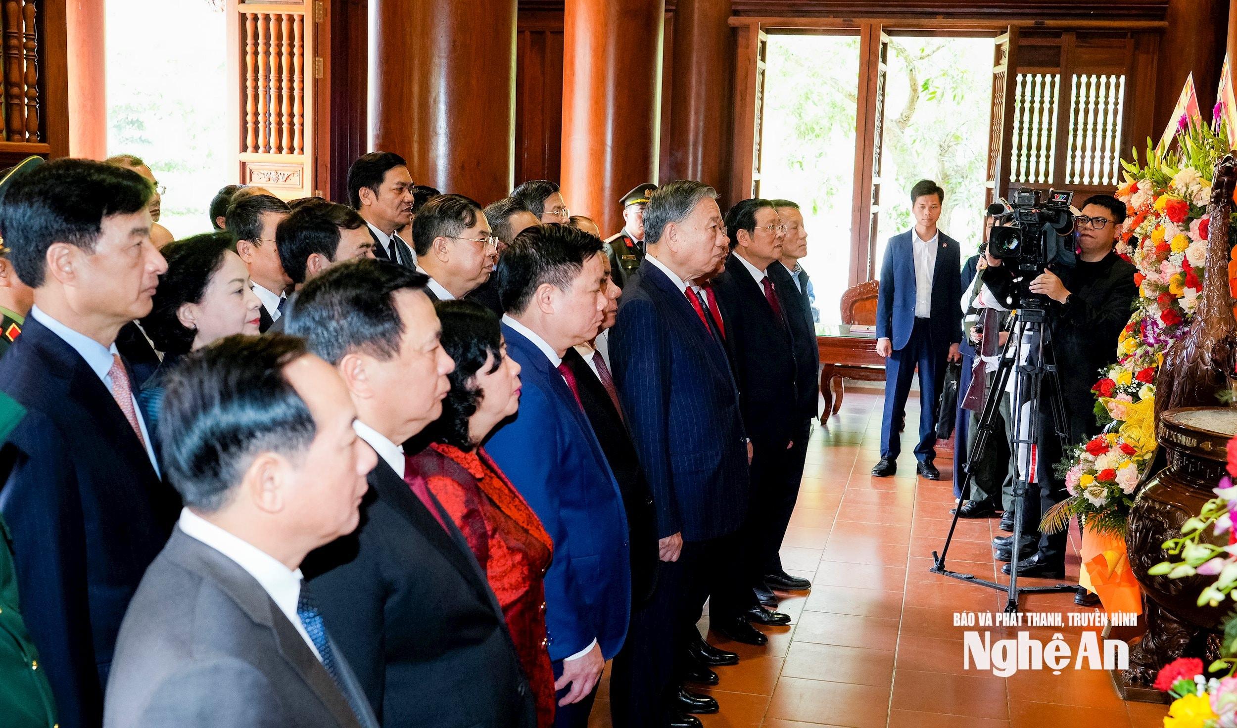 Trước đó, Tổng Bí thư Tô Lâm cùng đoàn đại biểu đã thành kính dâng lễ, dâng hoa, dâng hương tại đền Chung Sơn - đền thờ gia tiên Chủ tịch Hồ Chí Minh.