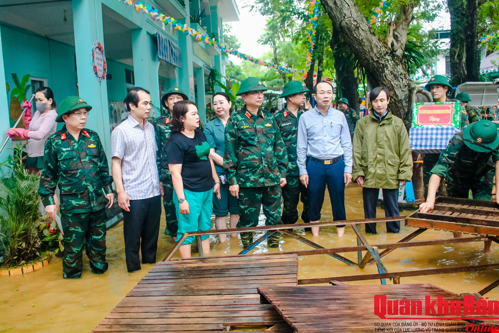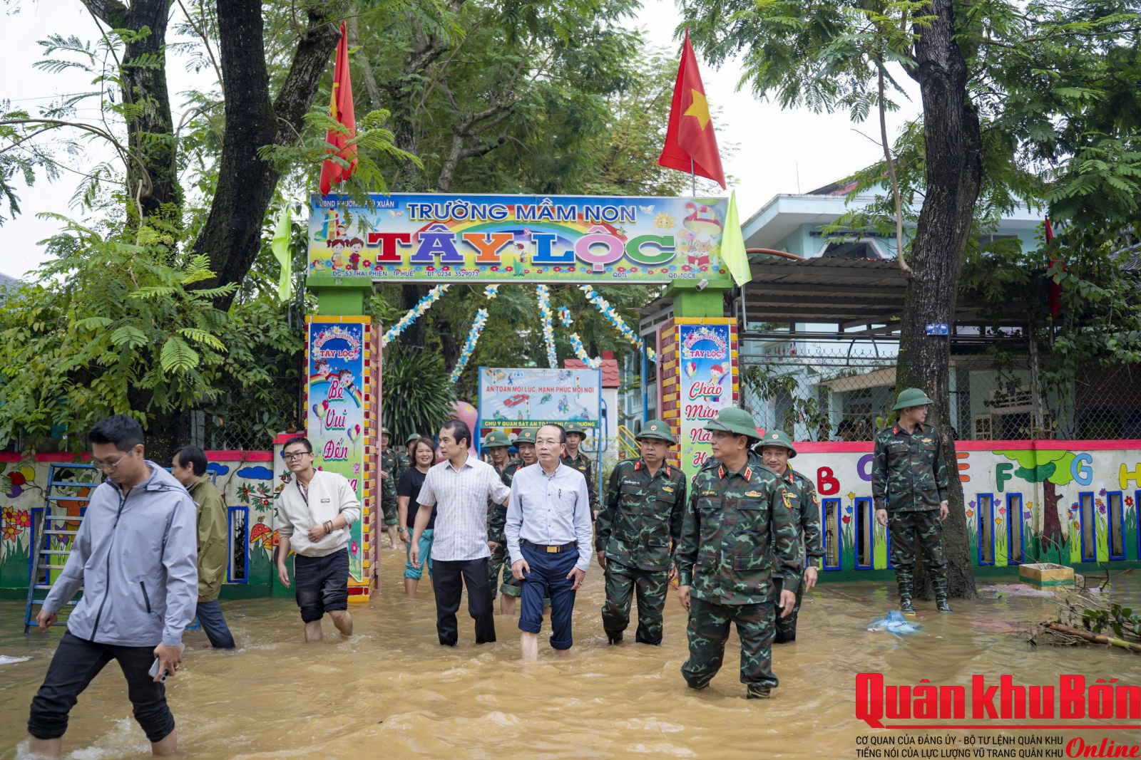 Đoàn công tác đã đến kiểm tra, động viên cán bộ, chiến sĩ Sư đoàn 968 đang tham gia dọn bùn đất, rác thải tại Chợ Tây Lộc, Trường Mầm non Tây Lộc và Trạm Y tế phường Vĩ Dạ (Cơ sở 3), những điểm chịu ảnh hưởng nặng nề trong đợt mưa lũ vừa qua.