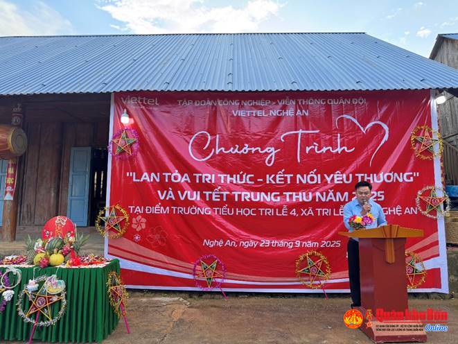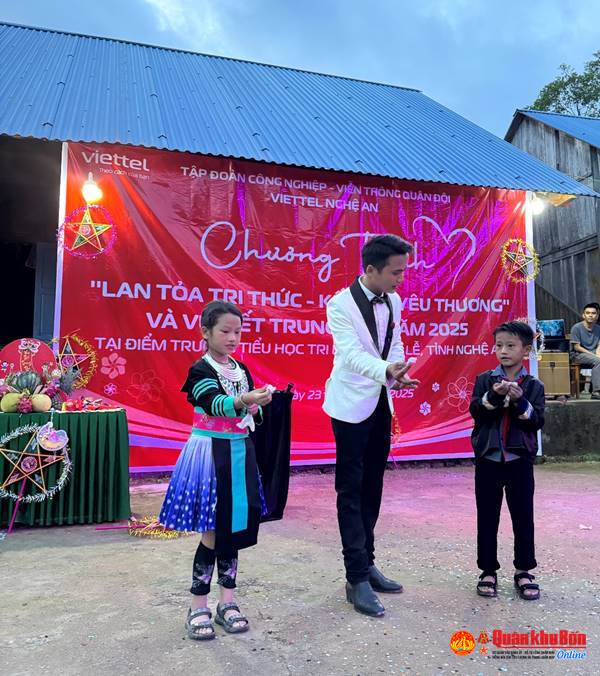 Tại Trường Tiểu học Tri Lễ 4 (xã Tri Lễ, huyện Quế Phong), Viettel Nghệ An vừa tổ chức chương trình “Lan tỏa tri thức, kết nối yêu thương” kết hợp Vui Tết Trung thu cho các em học sinh nơi đây. Chương trình đã mang đến cho thầy và trò ở xã nghèo biên giới nhiều tình cảm ấm áp, tràn ngập tiếng cười và tình yêu thương.