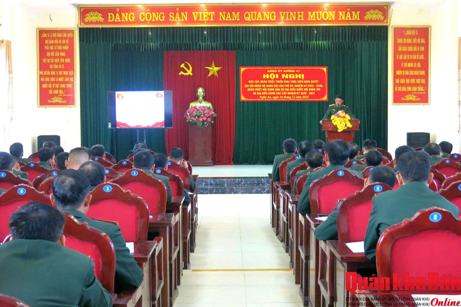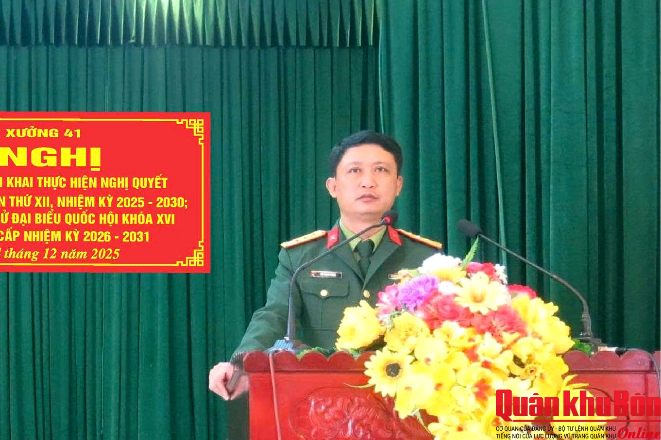 Chiều ngày 24/12/2025, Đảng ủy Xưởng 41 (Cục Hậu cần - Kỹ thuật Quân khu 4) tổ chức Hội nghị học tập, quán triệt, triển khai thực hiện Nghị quyết Đại hội Đảng bộ Quân đội lần thứ XII, nhiệm kỳ 2025 - 2030; quán triệt nội dung về bầu cử đại biểu Quốc hội khóa XVI và đại biểu Hội đồng nhân dân các cấp, nhiệm kỳ 2026 - 2031. Thượng tá Bùi Mạnh Hùng, Bí thư Đảng ủy, Chính trị viên Xưởng chủ trì Hội nghị. Tham dự hội nghị có các đồng chí trong Đảng ủy Xưởng cùng toàn thể cán bộ, đảng viên trong toàn đơn vị.