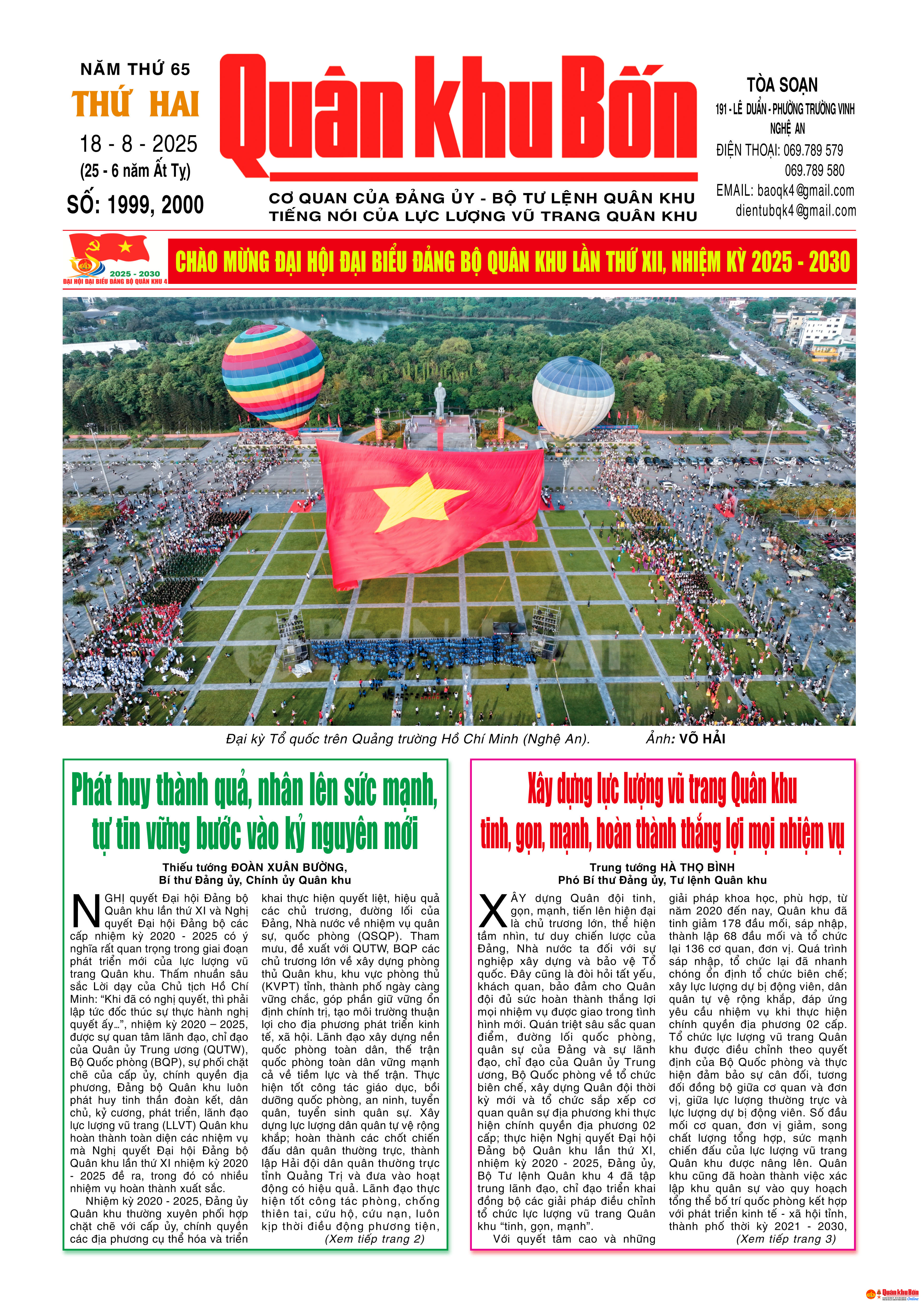 Số báo 1999-2000 (18/8/2025) chào mừng Đại hội đại biểu Đảng bộ Quân khu lần thứ XII, nhiệm kỳ 2025 - 2030