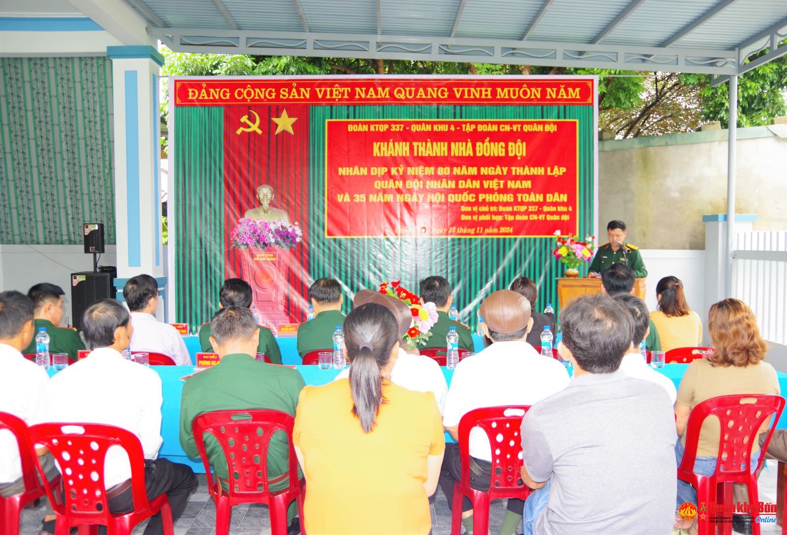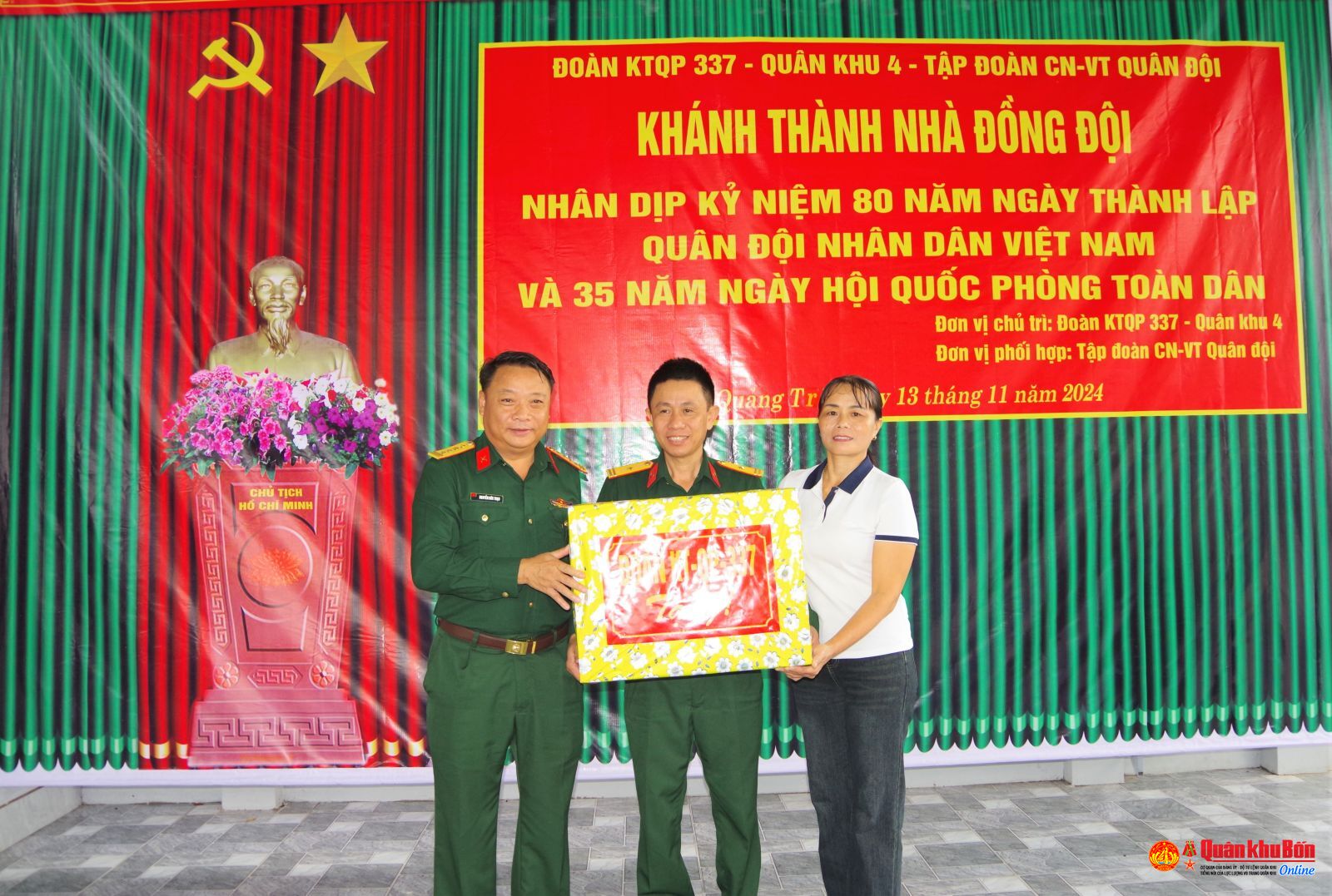 Ngày 13/11/2024, Đoàn Kinh tế - Quốc phòng (KT-QP) 337 phối hợp với Tập đoàn Công nghiệp - Viễn thông Quân đội và cấp ủy, chính quyền địa phương tổ chức Lễ khánh thành và bàn giao “Nhà đồng đội” tặng gia đình Thiếu tá Quân nhân chuyên nghiệp (QNCN) Lê Văn Tuấn, Y sĩ, Bệnh xá Quân dân y, Đoàn KT-QP 337. Đại tá Nguyễn Đức Thạo, Bí thư Đảng uỷ, Chính uỷ Đoàn dự và phát biểu Lễ bàn giao.