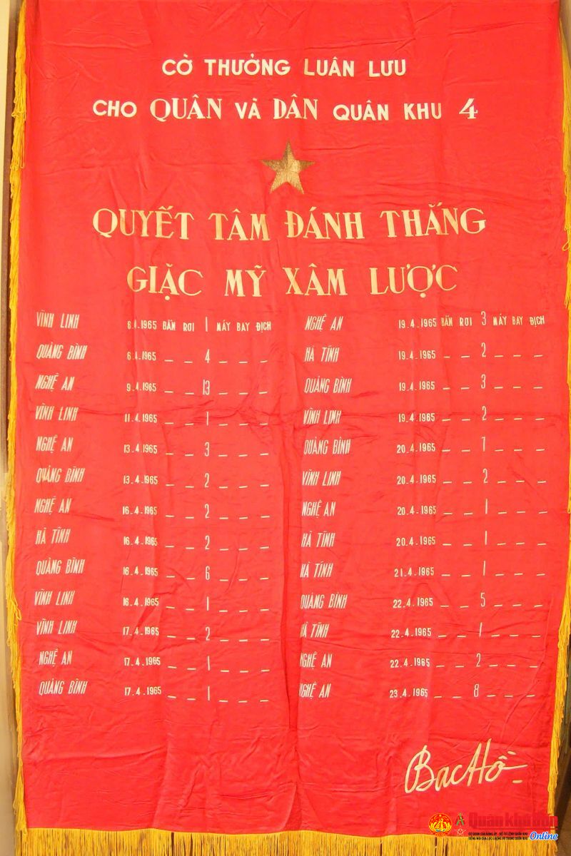 Gần 30 năm gắn bó với Bảo tàng Quân khu 4, với Đại tá Nguyễn Công Thành, mỗi kỷ vật đều gắn liền một câu chuyện, một dấu mốc không thể nào quên. Ông bảo, kỷ vật khiến ông xúc động nhất chính là lá cờ luân lưu mang dòng chữ: “Quyết tâm đánh thắng giặc Mỹ xâm lược”, do Chủ tịch Hồ Chí Minh tặng quân và dân Khu 4, năm 1965. Lá cờ nền đỏ, thêu chữ vàng ấy không chỉ là sự ghi nhận công lao, mà còn là biểu tượng danh dự, động lực thôi thúc quân và dân trên “tuyến lửa” thi đua bắn rơi máy bay Mỹ để được ghi danh lên cờ và rước cờ về địa phương.