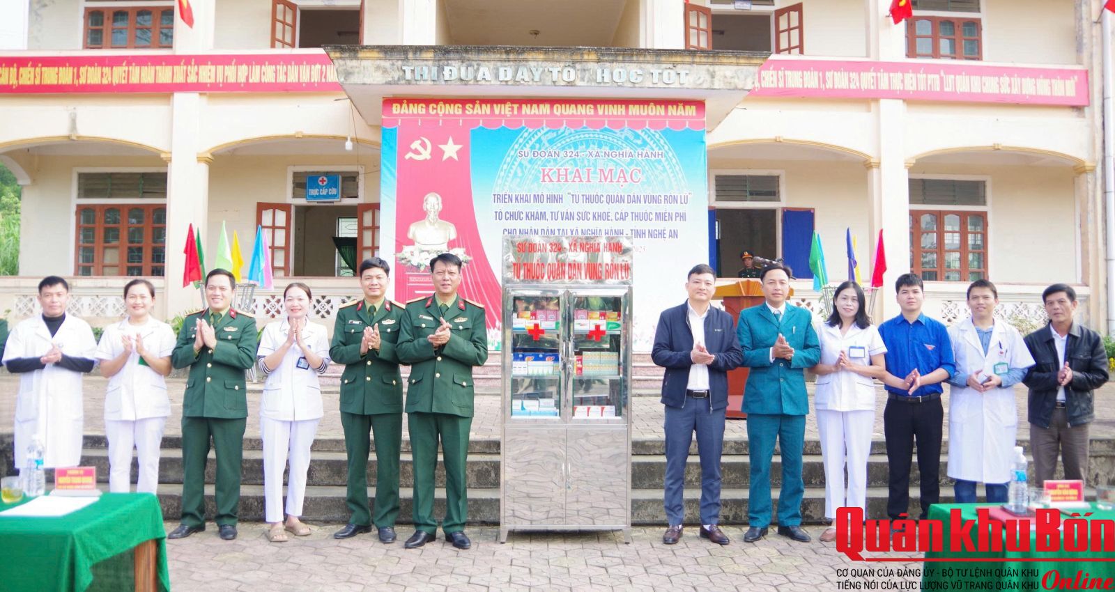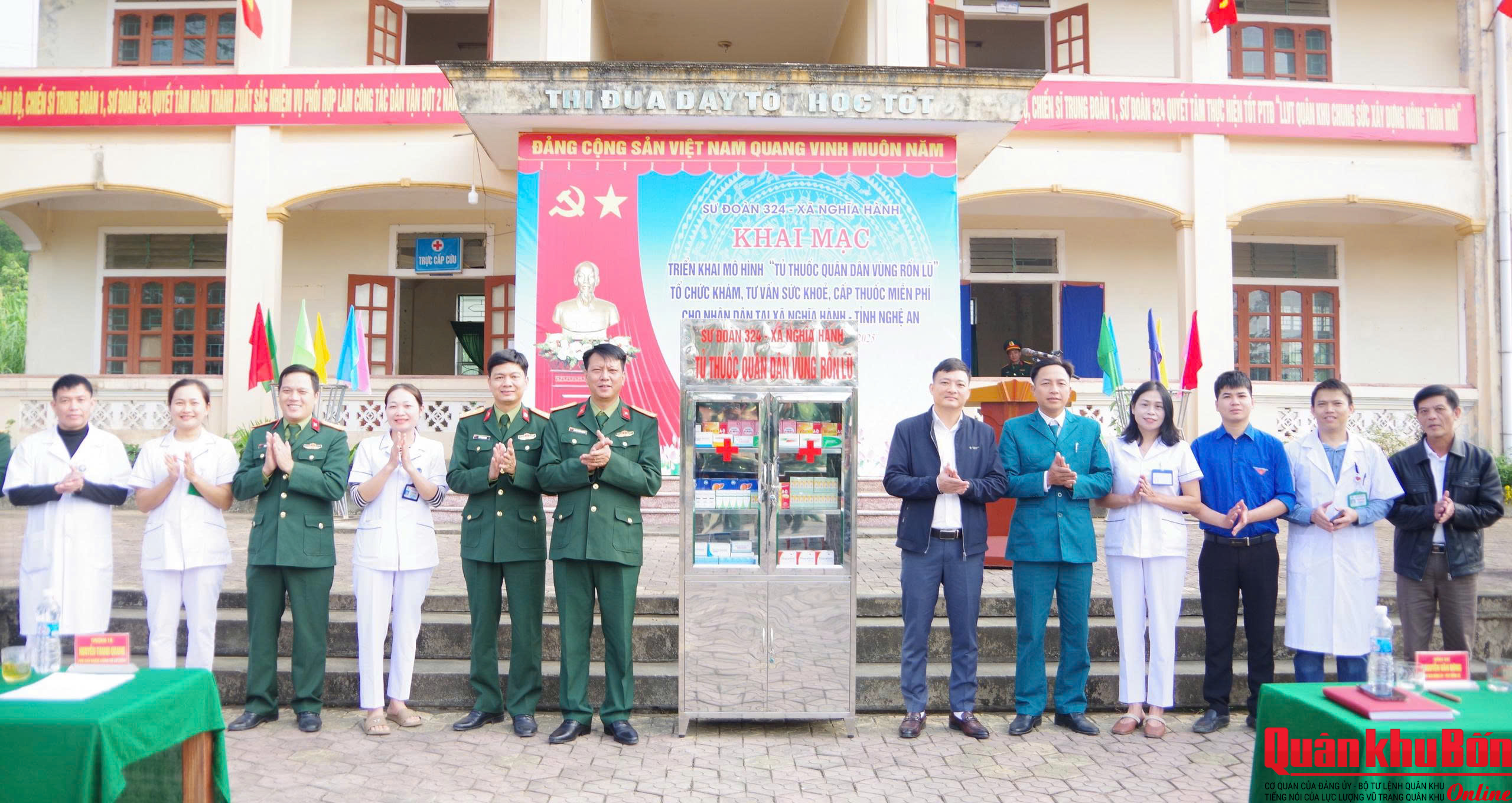 Ngày 24/12/2025, tại xã Nghĩa Hành, tỉnh Nghệ An, Sư đoàn 324 tổ chức triển khai mô hình “Tủ thuốc quân dân vùng rốn lũ”, kết hợp khám bệnh, tư vấn sức khỏe và cấp thuốc miễn phí cho bà con Nhân dân trên địa bàn. Dự chương trình có Thượng tá Nguyễn Thanh Quang, Phó Chủ nhiệm Chính trị Sư đoàn 324; đồng chí Nguyễn Văn Dũng, Ủy viên Ban Chấp hành Đảng bộ, Phó Chủ tịch Ủy ban Nhân dân xã Nghĩa Hành; cùng đại diện các ban, ngành, đoàn thể địa phương; cán bộ các cơ quan Sư đoàn; lãnh đạo, chỉ huy, cán bộ, chiến sĩ Trung đoàn 1, Tiểu đoàn Quân y 24 và đông đảo bà con Nhân dân xã Nghĩa Hành.