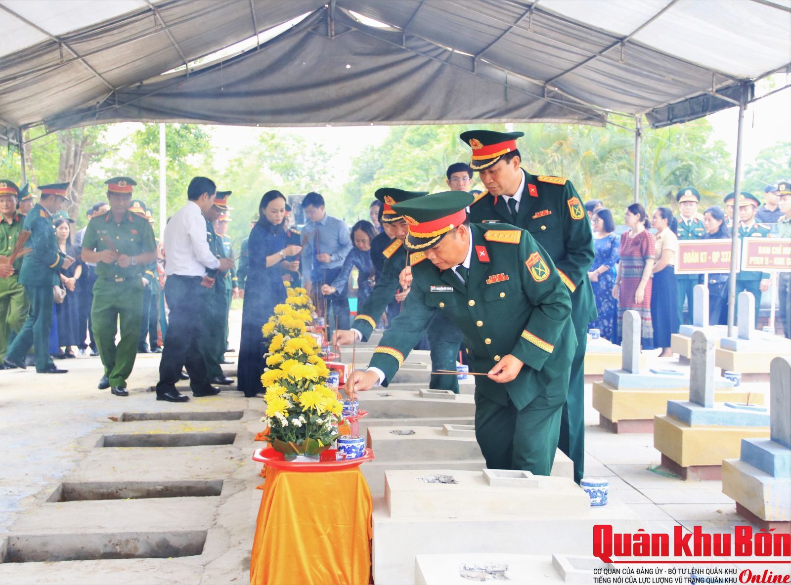 Sáng ngày 24/04/2026, tai Nghĩa trang Liệt sĩ xã Khe Sanh, tỉnh Quảng Trị, Đoàn Kinh tế - Quốc phòng (KT-QP) 337, Quân khu 4 đã phối hợp với Ban chỉ đạo 515 tỉnh Quảng Trị; Uỷ ban Nhân dân xã Khe Sanh trang trọng tổ chức Lễ truy điệu và an táng 08 Hài cốt Liệt sĩ (HCLS) được Đội Quy tập HCLS Đoàn KT-QP 337 tìm kiếm, quy tập từ ngày 11/03 đến 22/04/2026.