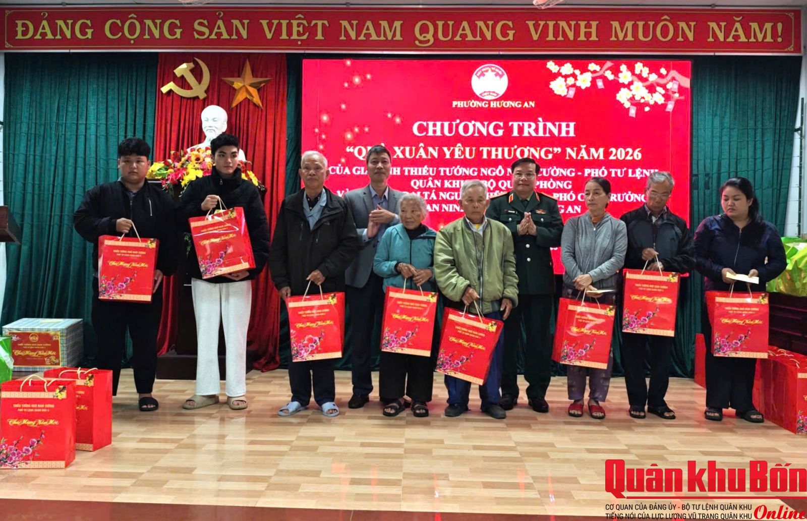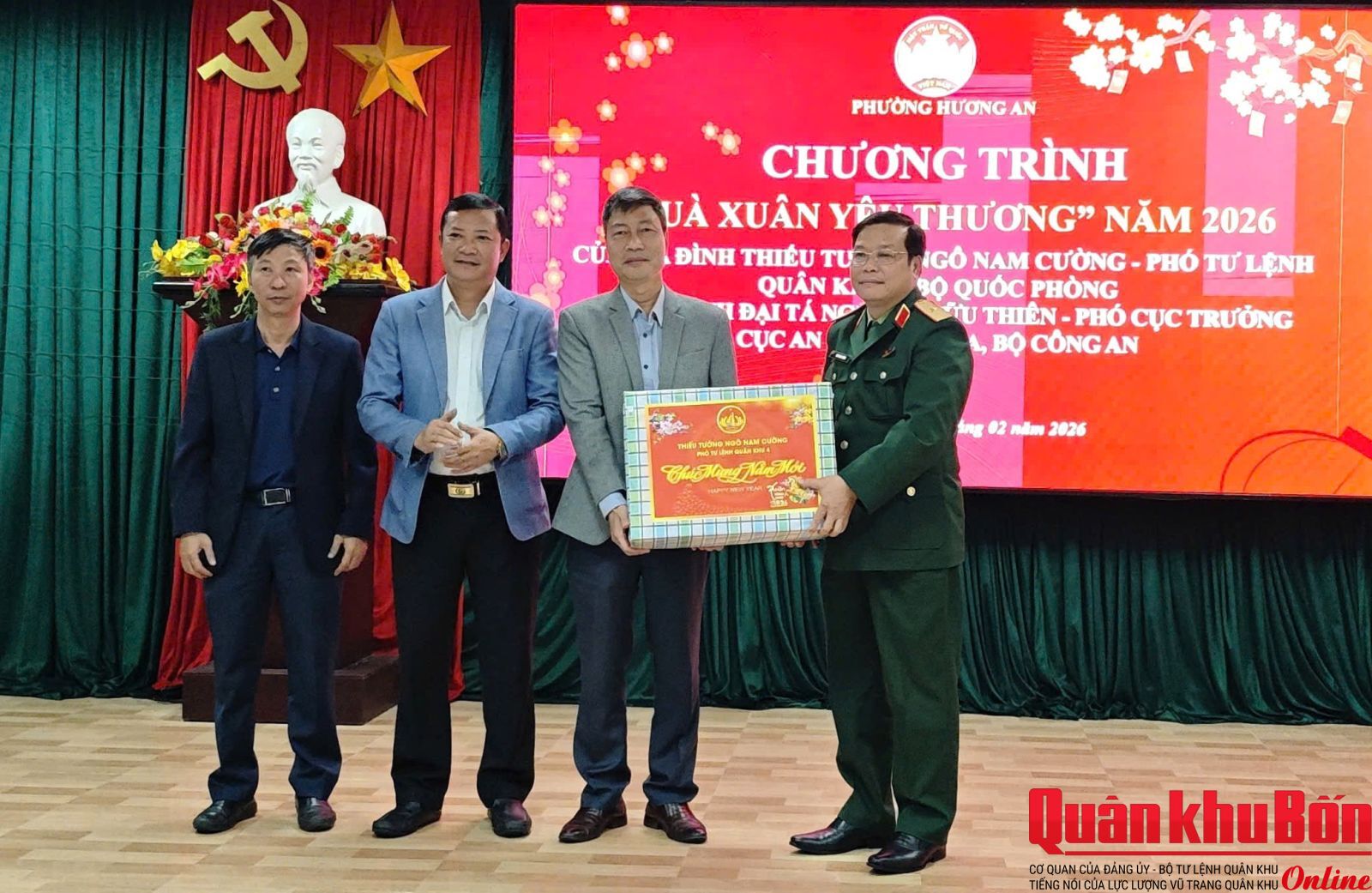 Nhân dịp Tết Nguyên đán Bính Ngọ 2026, Thiếu tướng Ngô Nam Cường, Phó Tư lệnh Quân khu 4 và Đại tá Nguyễn Hữu Thiên, Phó Cục trưởng Cục An ninh nội địa, Bộ Công an đã trao tặng 50 suất quà Tết cho các hộ gia đình chính sách có hoàn cảnh khó khăn trên địa bàn phường Hương An, thành phố Huế.