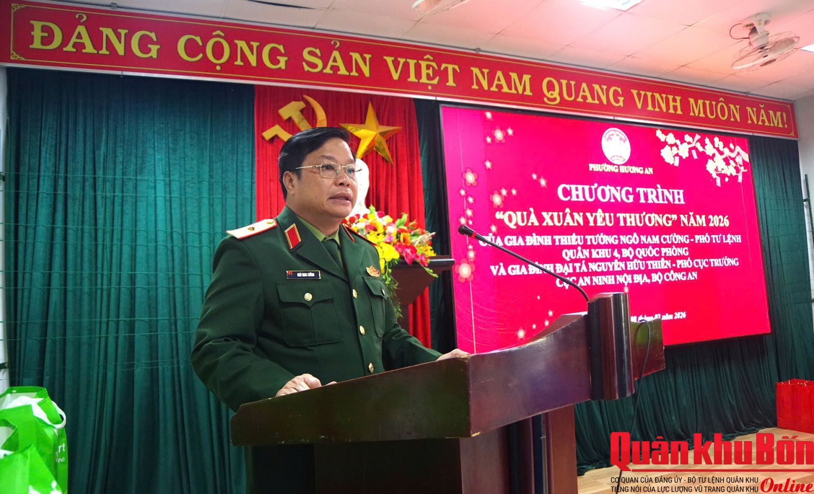 Phát biểu tại buổi gặp mặt tặng quà, Thiếu tướng Ngô Nam Cường, Phó Tư lệnh Quân khu 4 đã bày tỏ sự xúc động khi về thăm quê hương. Đồng chí Phó Tư lệnh Quân khu đã gửi lời chúc Tết an khang, thịnh vượng đến cấp ủy Đảng, chính quyền, các gia đình chính sách và Nhân dân trên địa bàn; mong muốn các gia đình tiếp tục phát huy truyền thống cách mạng, nỗ lực vươn lên trong cuộc sống góp phần xây dựng phường Hương An ngày càng phát triển toàn diện. Đồng thời, đề nghị các lực lượng tăng cường công tác đảm bảo tình hình an ninh trật tự để bà con Nhân dân đón tết Bính Ngọ 2026 đầm ấm, vui tươi, hạnh phúc.