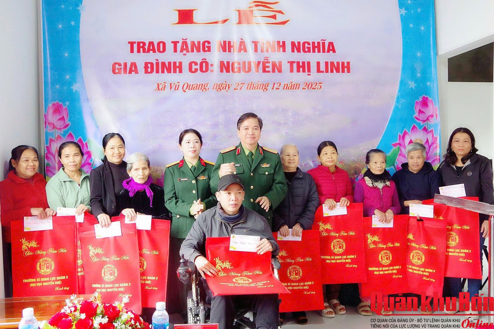 Nhân dịp kỷ niệm 81 năm Ngày thành lập Quân đội nhân dân Việt Nam (22/12/1944 - 22/12/2025) và 36 năm Ngày hội Quốc phòng toàn dân (22/12/1989 - 22/12/2025), sáng 27/12/2025, Trường Sĩ quan Lục quân 2 phối hợp với Ủy ban Mặt trận Tổ quốc xã Vũ Quang và Ban Chỉ huy Phòng thủ khu vực 2 - Vũ Quang (Bộ Chỉ huy Quân sự tỉnh Hà Tĩnh) tổ chức Lễ trao tặng nhà tình nghĩa cho gia đình bà Nguyễn Thị Linh, trú tại thôn 1, xã Vũ Quang, tỉnh Hà Tĩnh.