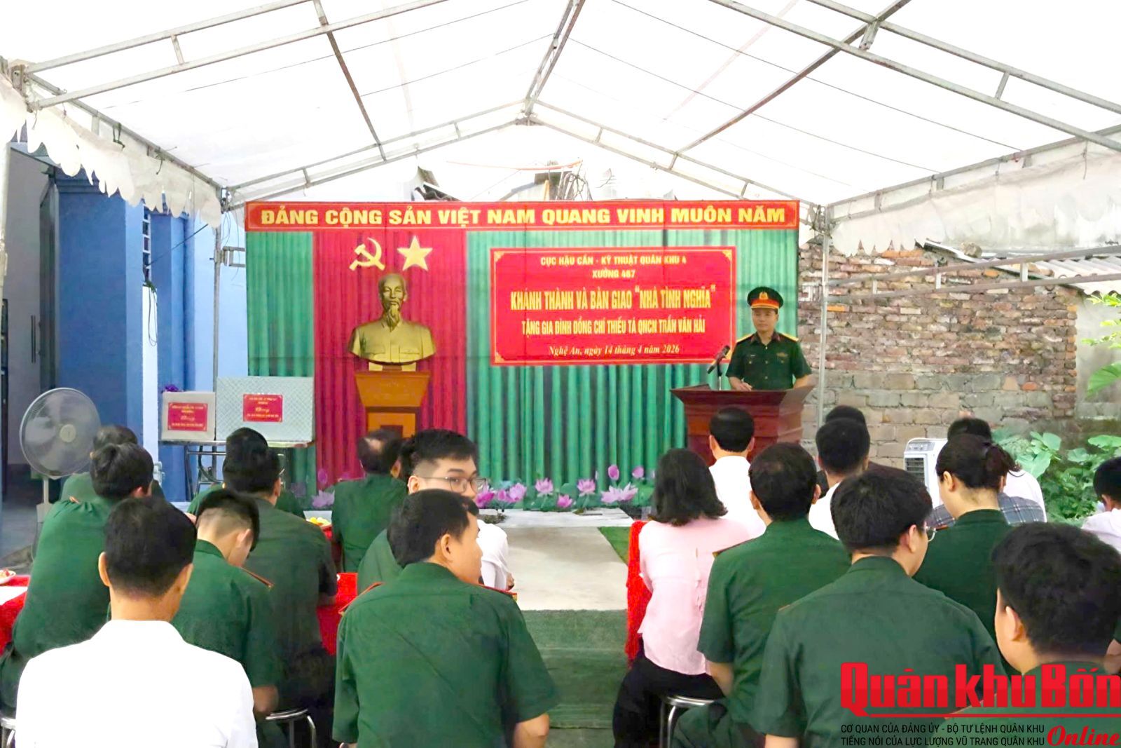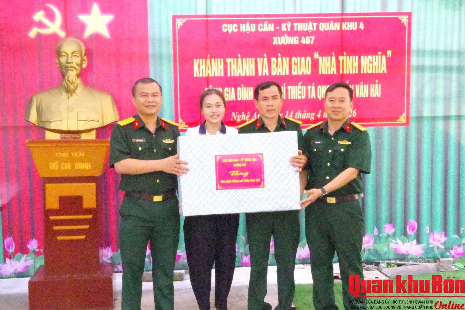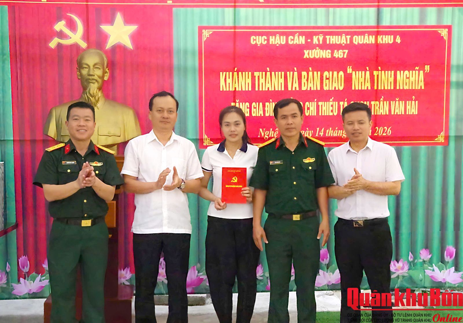 Sáng 14/4/2026, tại khối 34, phường Vinh Hưng, tỉnh Nghệ An, Xưởng 467, Cục Hậu cần - Kỹ thuật Quân khu 4 tổ chức khánh thành, bàn giao nhà tình nghĩa tặng gia đình Thiếu tá QNCN Trần Văn Hải, thợ mộc đệm, Phân xưởng 2, Xưởng 467.