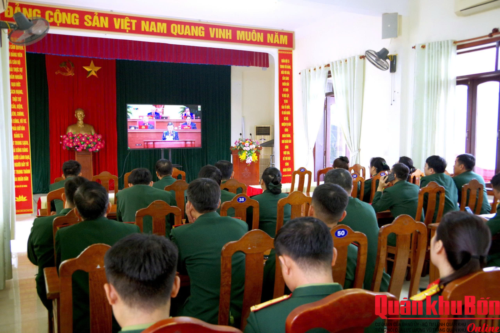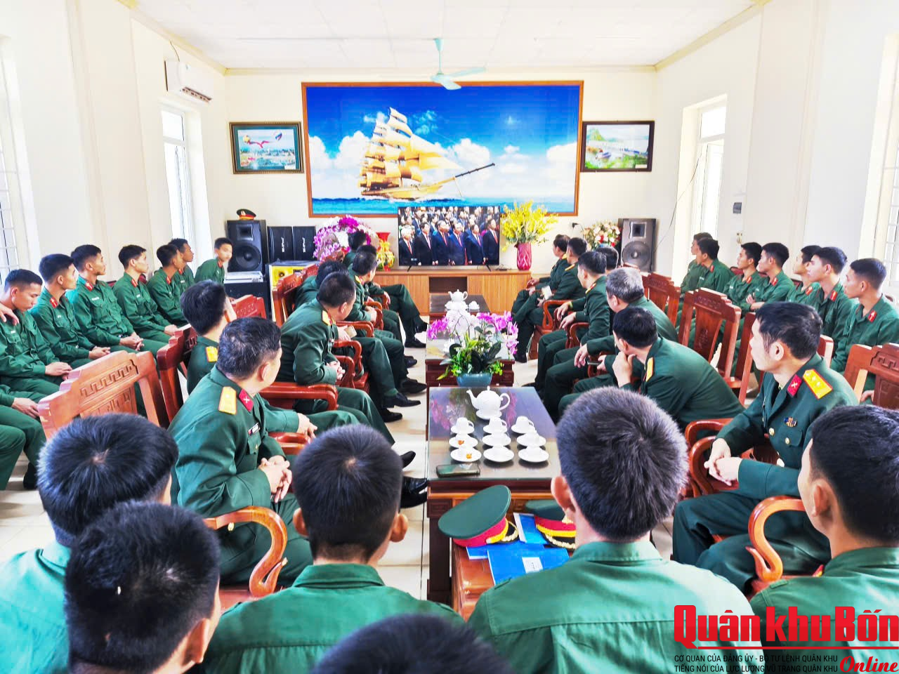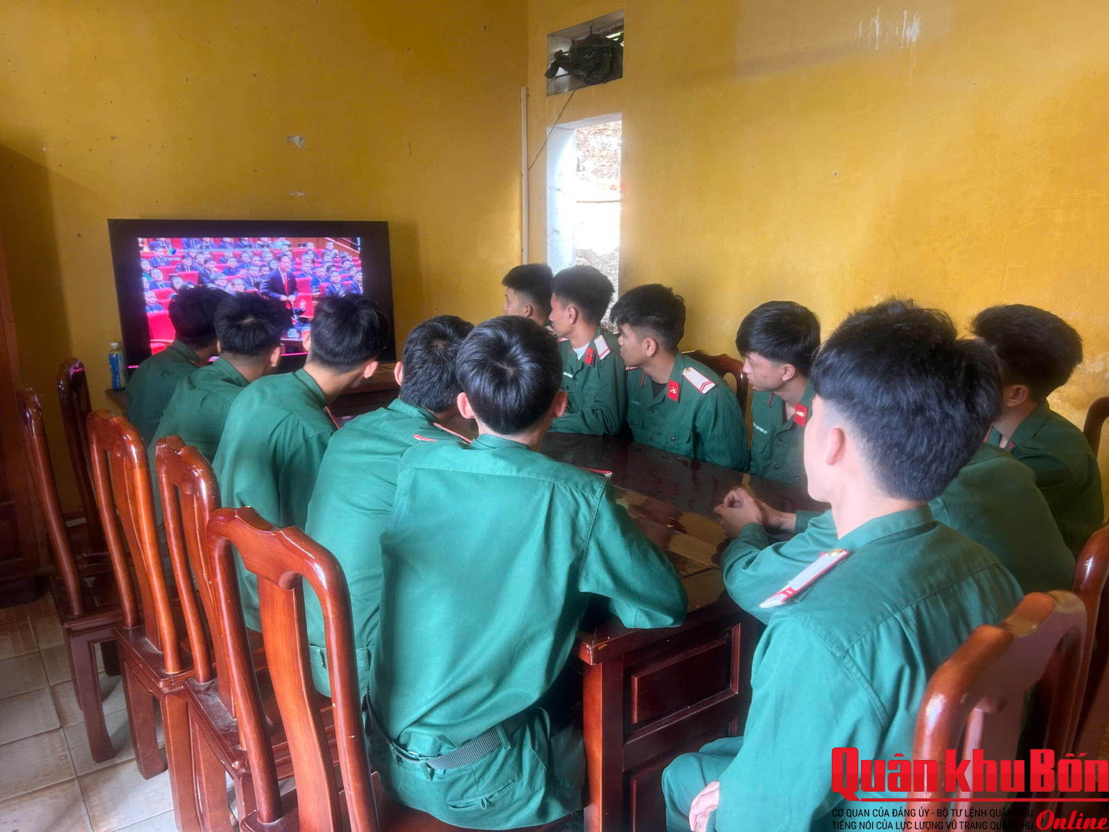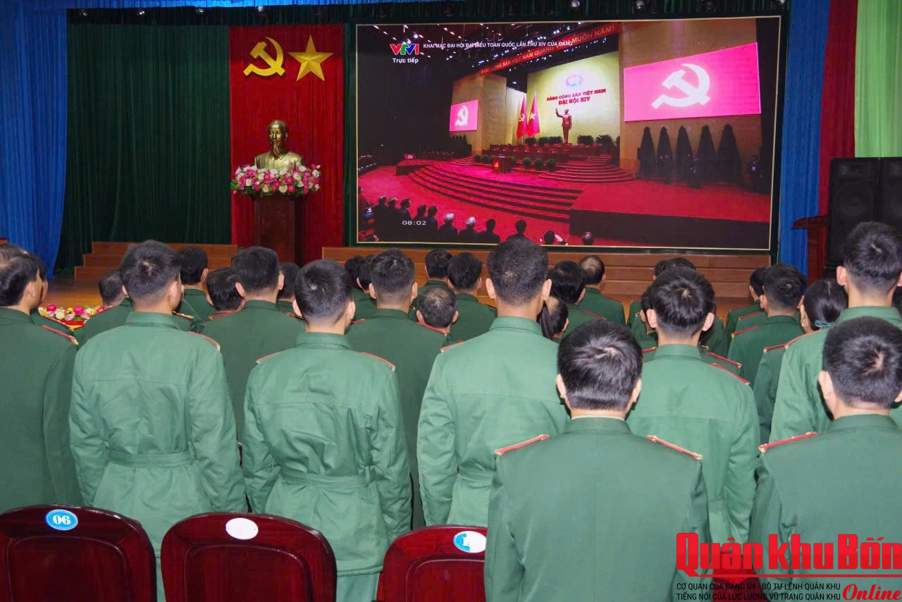 Tại các hội trường, phòng họp, phòng Hồ Chí Minh và các điểm sinh hoạt tập trung, cán bộ, chiến sĩ LLVT Quân khu 4 tập trung quân số cao nhất xem các nội dung của phiên khai mạc. Không khí theo dõi Đại hội diễn ra trang trọng, thể hiện niềm tin, sự phấn khởi và kỳ vọng của cán bộ, chiến sĩ LLVT Quân khu 4 đối với những quyết sách quan trọng của Đảng trong giai đoạn phát triển mới của đất nước.