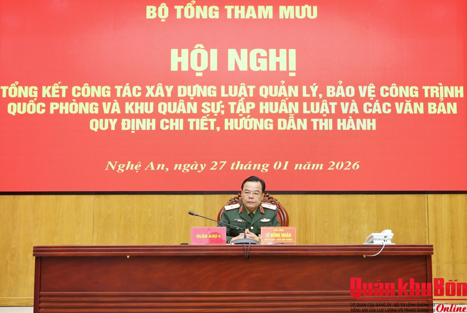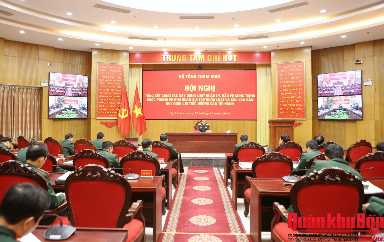 Chiều 27/1/2026, Bộ Tổng Tham mưu Quân đội Nhân dân Việt Nam tổ chức Hội nghị tổng kết công tác xây dựng Luật Quản lý, bảo vệ công trình quốc phòng và khu quân sự; tập huấn Luật và các văn bản quy định chi tiết, hướng dẫn thi hành. Thượng tướng Huỳnh Chiến Thắng, Phó Tổng Tham mưu trưởng Quân đội nhân dân Việt Nam, chủ trì Hội nghị.