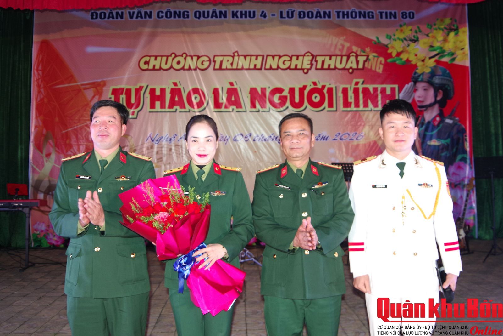 Tối 09/01/2026, Đoàn Văn công Quân khu 4 tổ chức biểu diễn chương trình nghệ thuật với chủ đề “Tự hào là người lính” tại Tiểu đoàn 3, Lữ đoàn Thông tin 80, Quân khu 4. Dự chương trình có Thượng tá Nguyễn Hồng Sơn, Phó Chính ủy Lữ đoàn Thông tin 80; Trung tá Nguyễn Thị Quỳnh Thương, Phó Đoàn trưởng Đoàn Văn công Quân khu; cùng chỉ huy các cơ quan, đơn vị và đông đảo cán bộ, chiến sĩ Lữ đoàn, Nhân dân trên địa bàn.