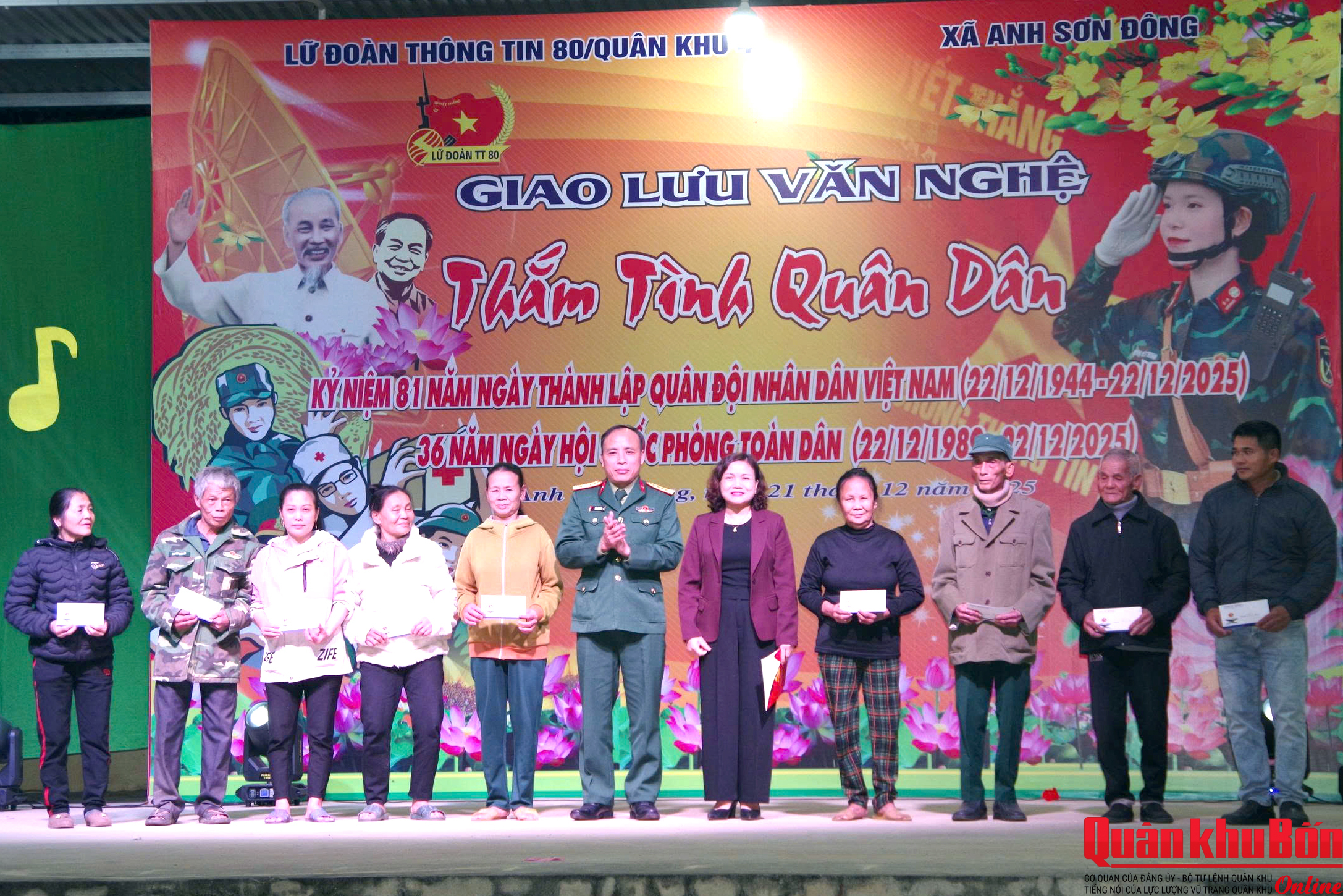 Tối 21/12/2025, Lữ đoàn Thông tin 80 (Quân khu 4) phối hợp với Ủy ban Nhân dân xã xã Anh Sơn Đông, tỉnh Nghệ An tổ chức chương trình giao lưu văn nghệ “Thắm tình quân dân” và tặng quà cho các gia đình chính sách, hộ nghèo trên địa bàn. Đây là hoạt động ý nghĩa chào mừng kỷ niệm 81 năm Ngày thành lập Quân đội nhân dân Việt Nam (22/12/1944 - 22/12/2025) và 36 năm Ngày hội Quốc phòng toàn dân (22/12/1989 - 22/12/2025).