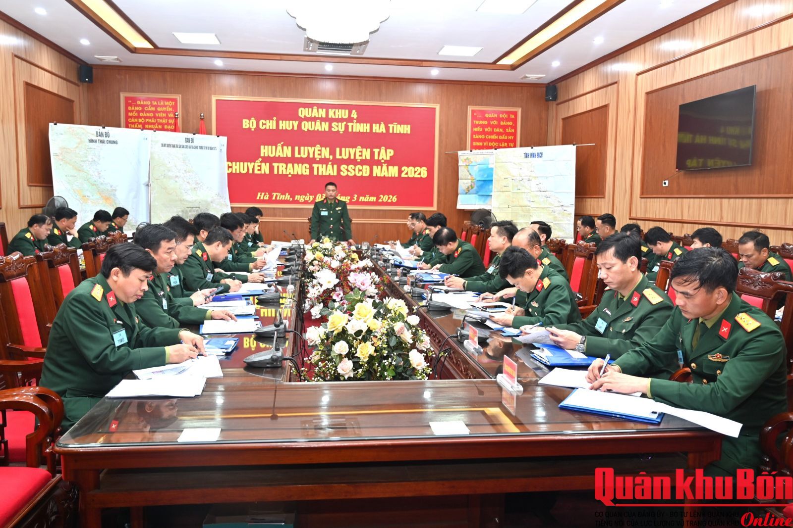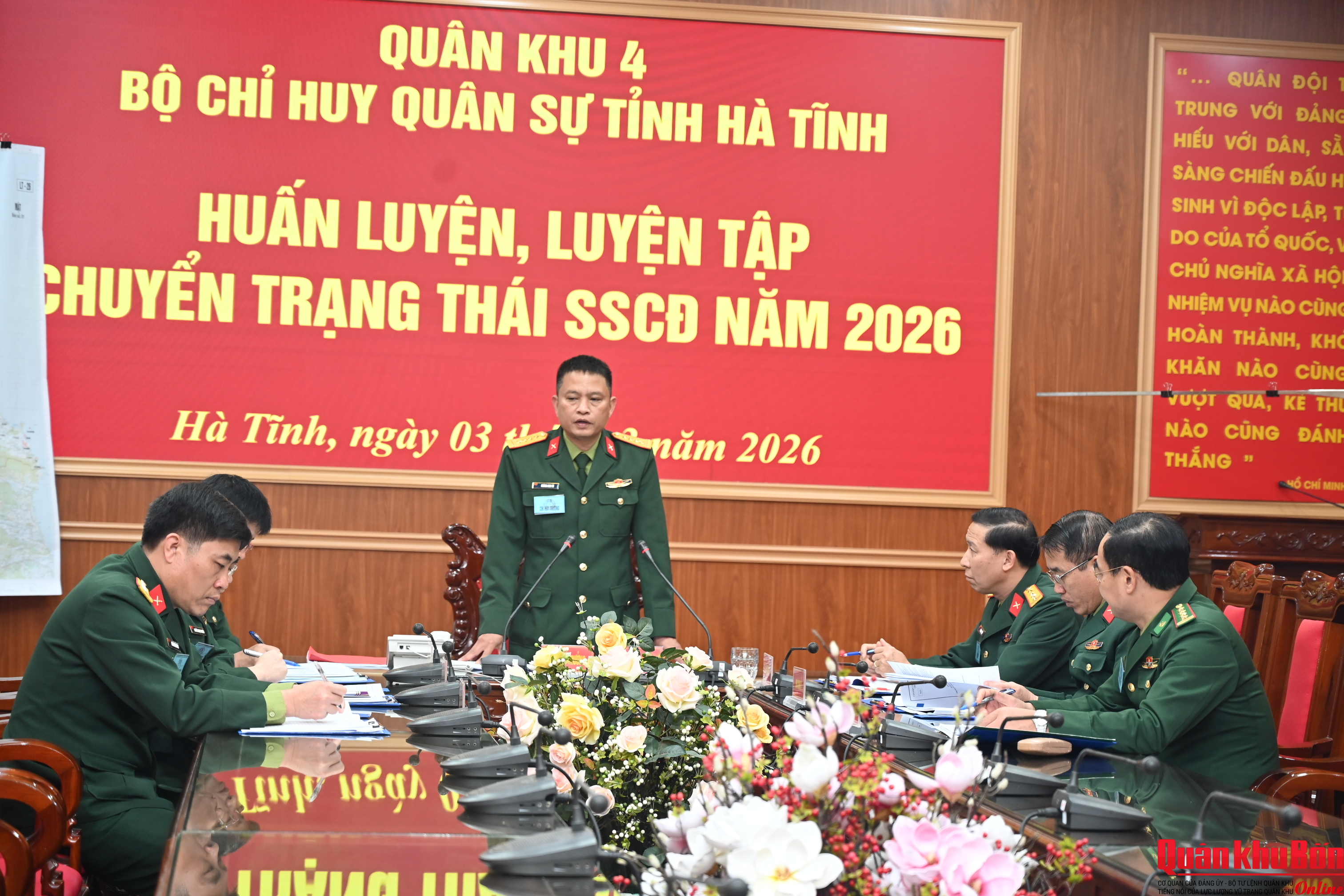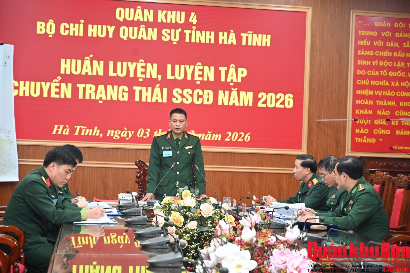 Trong 2 ngày 03 và 04/2/2026, Bộ CHQS tỉnh Hà Tĩnh đã tổ chức thành công luyện tập chuyển trạng thái sẵn sàng chiến đấu (SSCĐ) năm 2026 bảo đảm chặt chẽ, đúng nguyên tắc, an toàn tuyệt đối. Đại tá Nguyễn Hữu Đàn, Phó Tham mưu trưởng Quân khu 4 dự, theo dõi và chỉ đạo cuộc luyện tập. Tham gia theo dõi, chỉ đạo còn có đại biểu các cơ quan: Phòng Tác chiến; Phòng Quân lực, Bộ Tham mưu Quân khu; Phòng Xe máy, Vận tải, Cục Hậu cần – Kỹ thuật Quân khu.