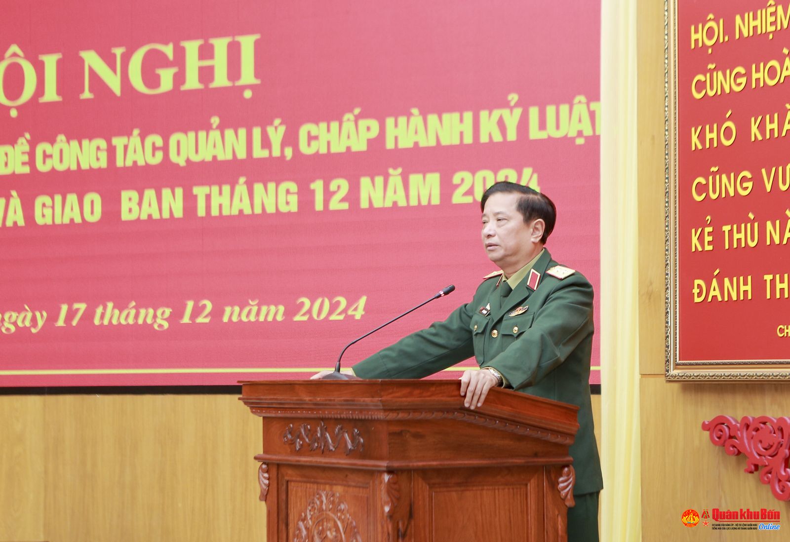Sáng ngày 17/12/2024, Bộ Tư lệnh Quân khu đã tổ chức Hội nghị Rút kinh nghiệm chuyên đề công tác quản lý, chấp hành kỷ luật, bảo đảm an toàn và giao ban tháng 12 năm 2024. Trung tướng Hà Thọ Bình, Phó Bí thư Đảng ủy, Tư lệnh Quân khu chủ trì Hội nghị. Trung tướng Trần Võ Dũng, Bí thư Đảng ủy, Chính ủy Quân khu dự Hội nghị. Tham dự Hội nghị có các đồng chí trong Ban Thường vụ Đảng ủy, Thủ trưởng Bộ Tư lệnh; thủ trưởng các cơ quan, phòng, ban Quân khu và lãnh đạo, chỉ huy các đơn vị trực thuộc.