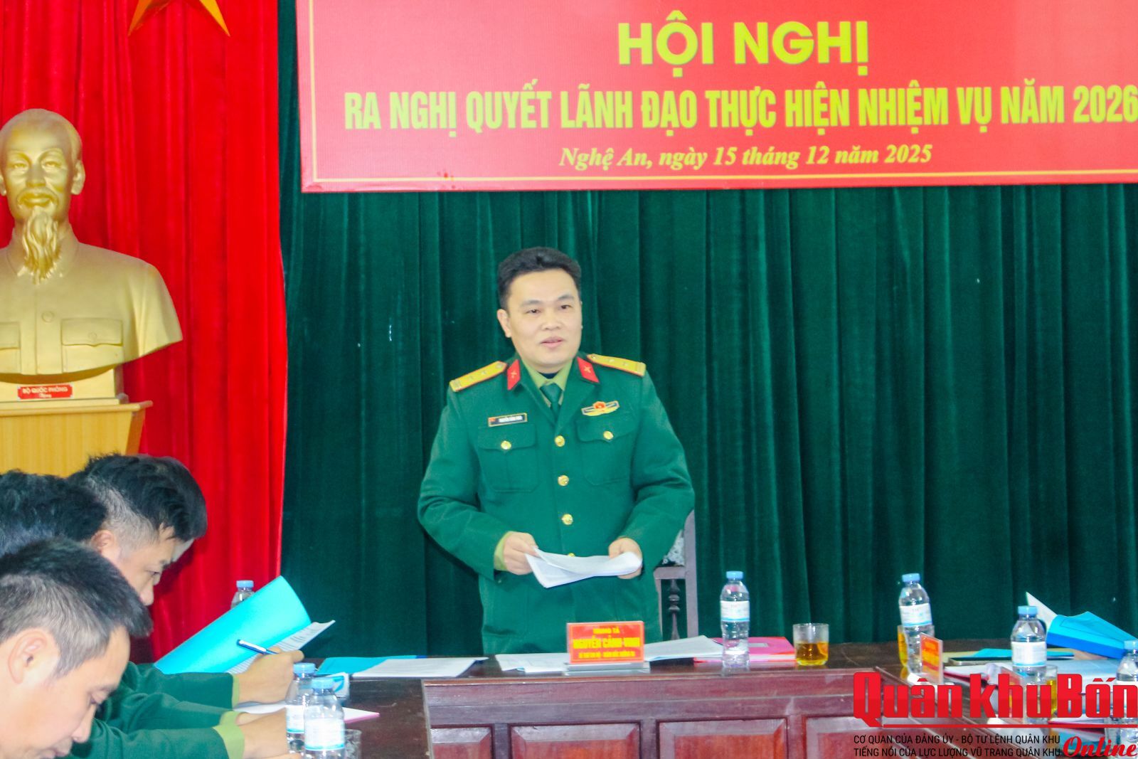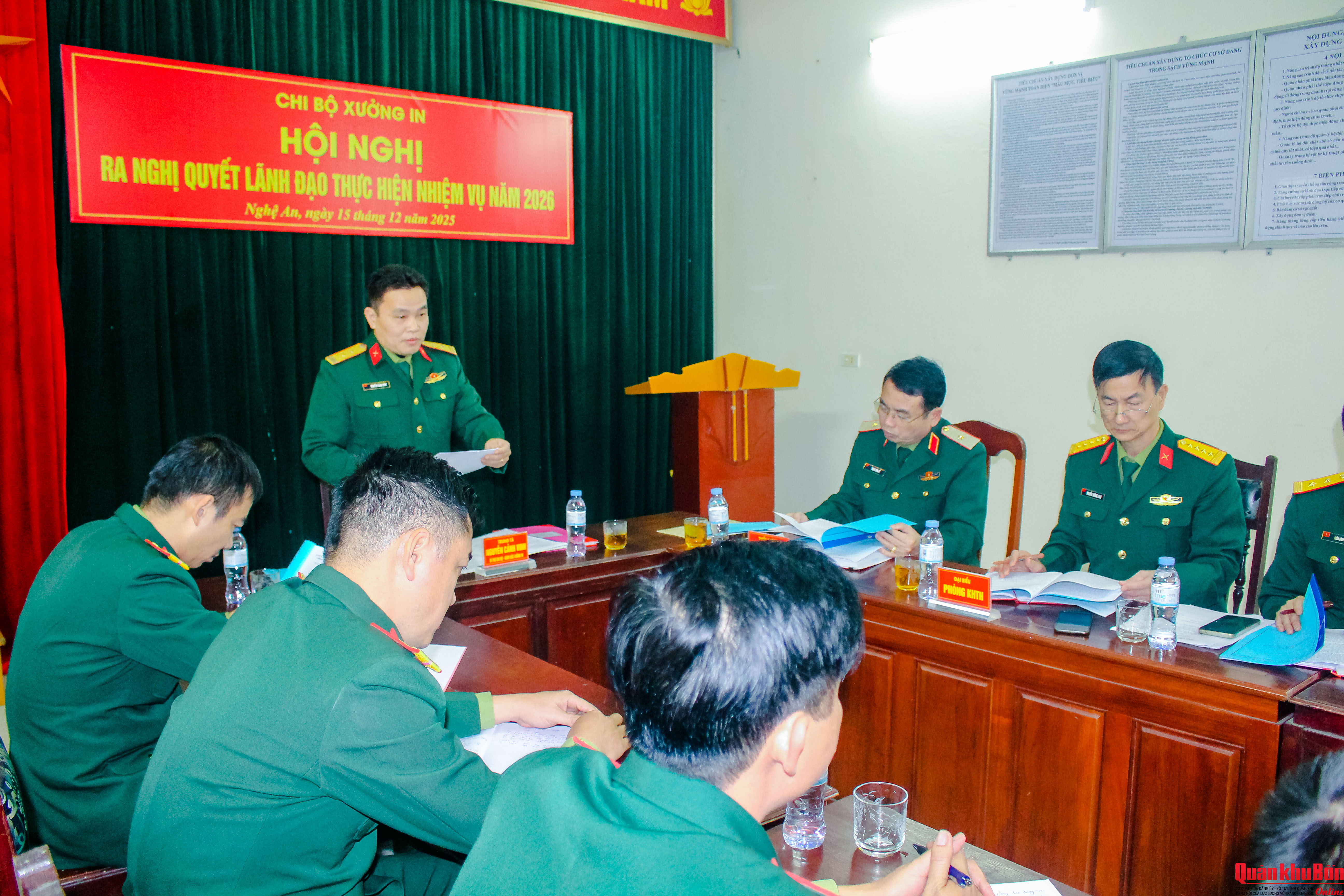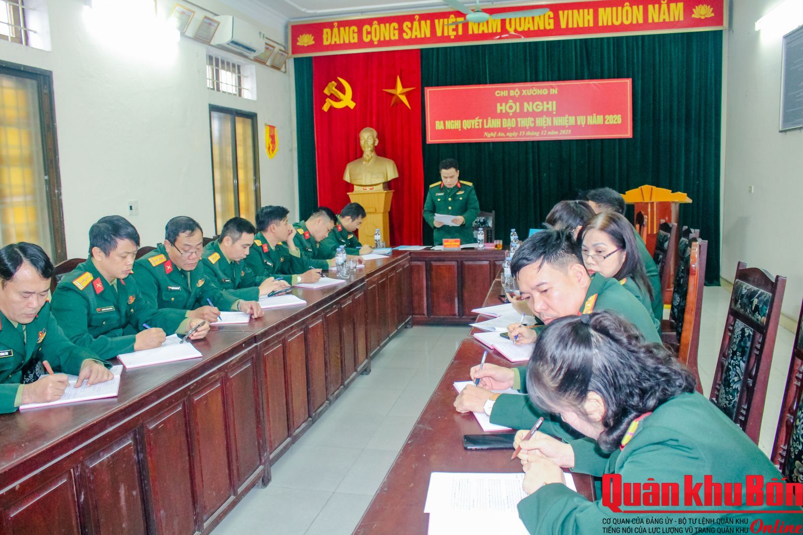 Chiều ngày 15/12/2025, Chi bộ Xưởng in Quân khu 4 tổ chức Hội nghị ra nghị quyết lãnh đạo thực hiện nhiệm vụ năm 2026. Thiếu tướng Phan Văn Sỹ, Bí thư Đảng ủy Cục Chính trị, Phó Chủ nhiệm Chính trị Quân khu dự, chỉ đạo hội nghị. Tham dự hội nghị có Đại tá Nguyễn Thăng Long, Đảng ủy viên, Phó Chủ nhiệm Ủy ban Kiểm tra Đảng ủy Cục Chính trị; đại biểu Phòng Kế hoạch Tổng hợp. Trung tá Nguyễn Cảnh Vinh, Bí thư Chi bộ, Giám đốc Xưởng in Quân khu 4 chủ trì hội nghị.