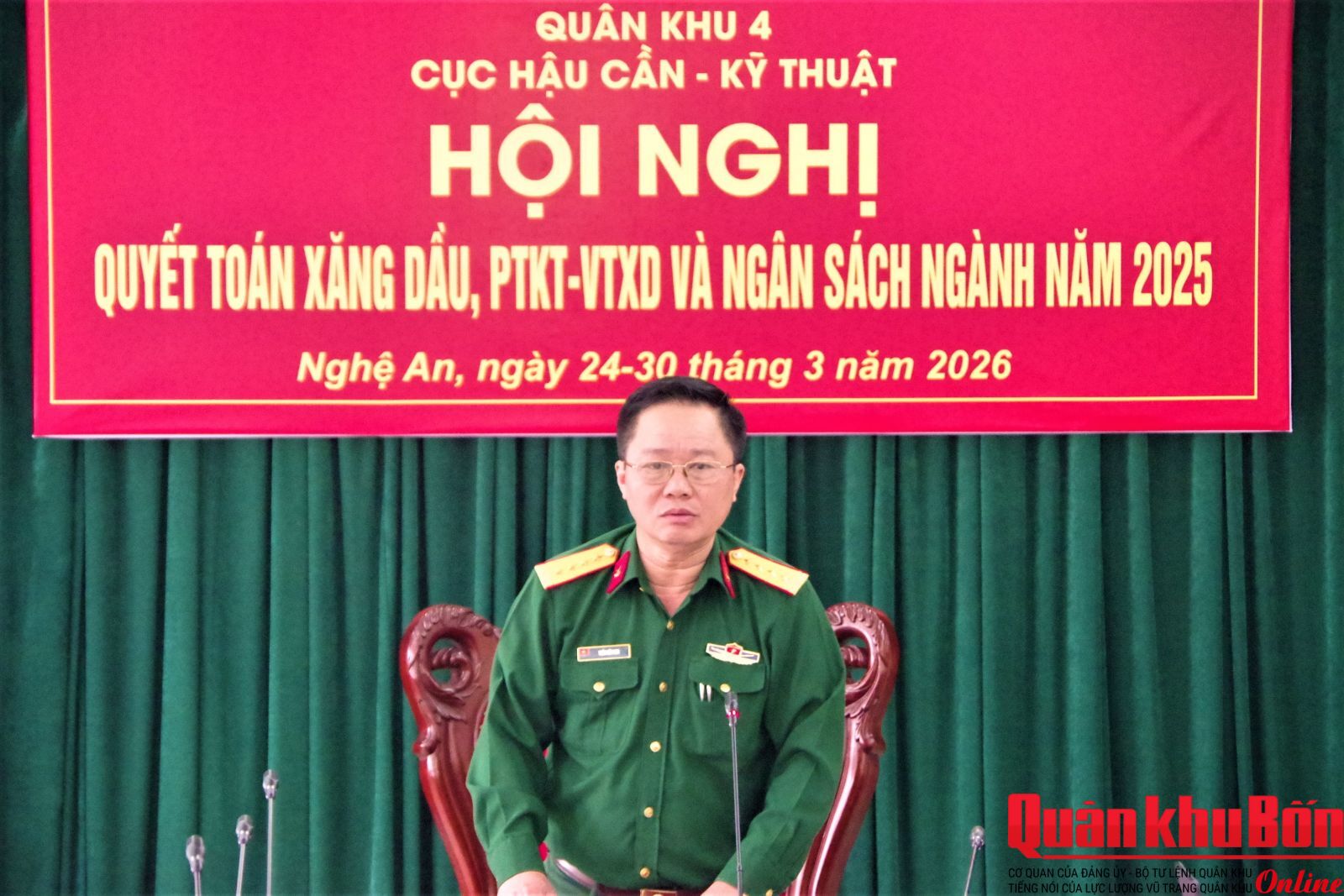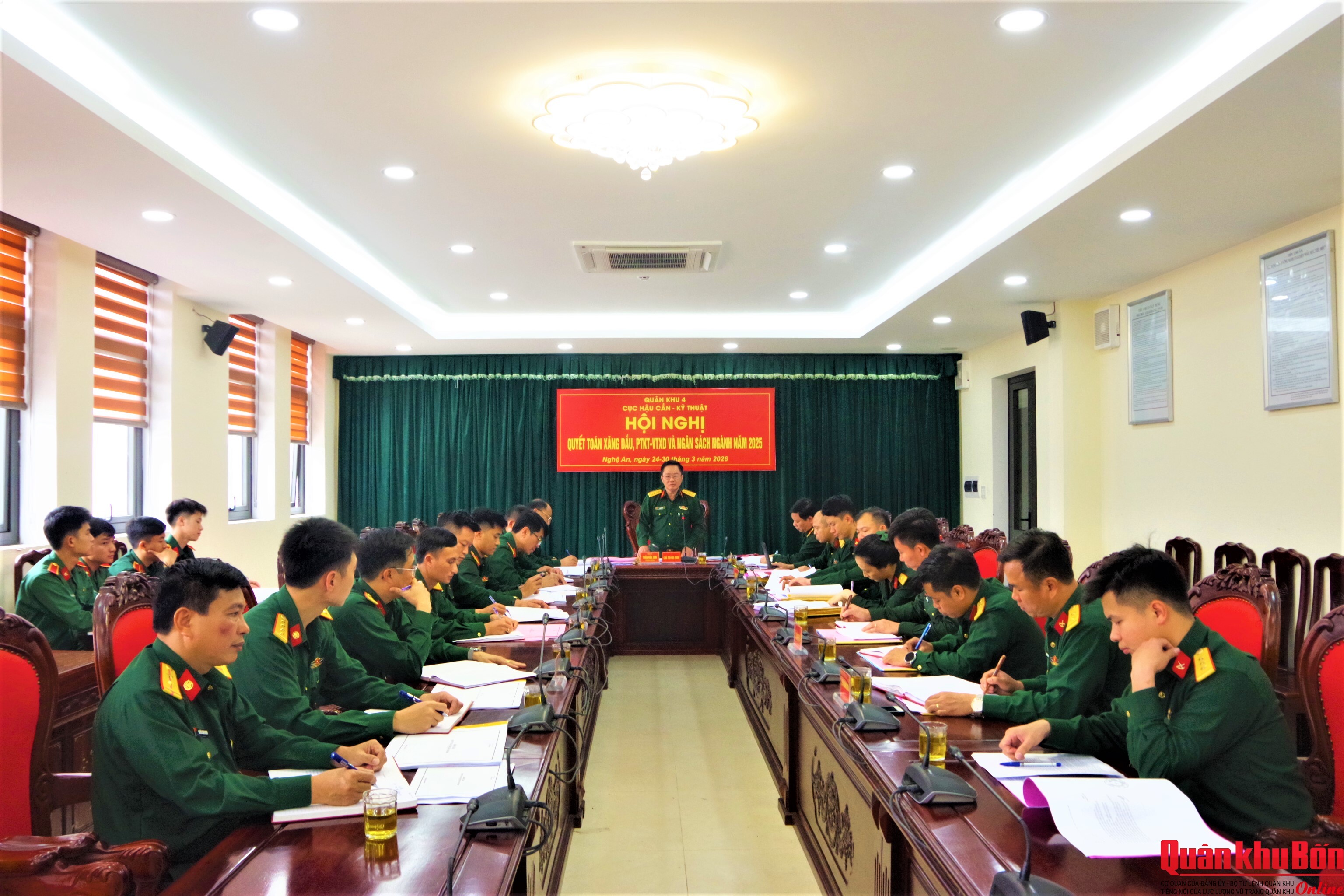 Ngày 24/3/2026, Cục Hậu cần - Kỹ thuật Quân khu 4 tổ chức Hội nghị thanh quyết toán xăng dầu, phương tiện kỹ thuật, vật tư và ngân sách ngành xăng dầu năm 2025 đối với các cơ quan, đơn vị. Đại tá Trần Hữu Sơn, Trưởng Phòng Xăng dầu, Cục Hậu cần - Kỹ thuật, Phó Chủ tịch Hội đồng quyết toán xăng dầu Quân khu, chủ trì Hội nghị.