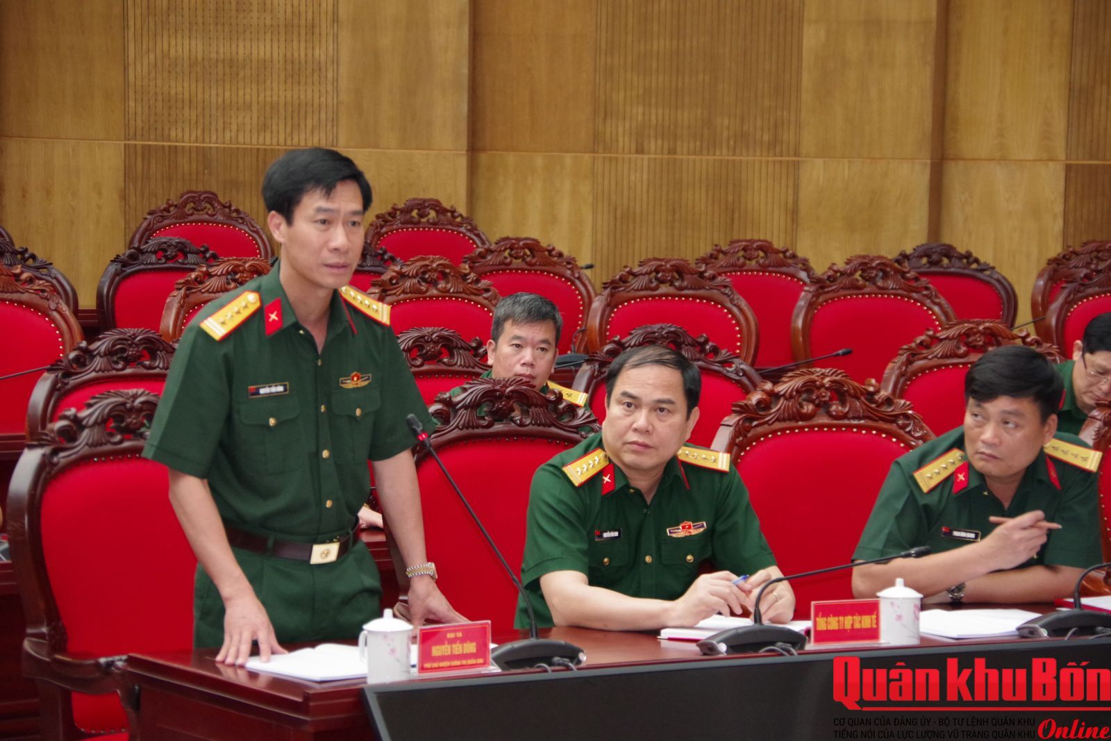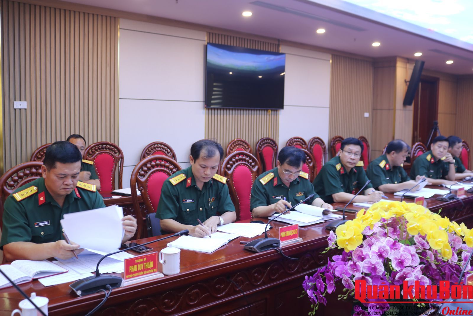 Đồng chí Thiếu tướng Ngô Nam Cường, Phó Tư lệnh Quân khu, Trưởng Tiểu ban bảo đảm và đồng chí Thiếu tướng Hoàng Duy Chiến, Phó Tư lệnh Quân khu, Trưởng Tiểu ban trưng bày, triển lãm chủ trì hội nghị.
