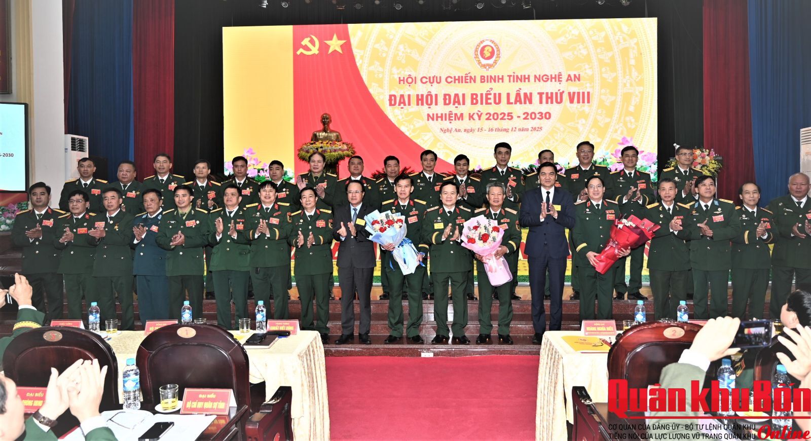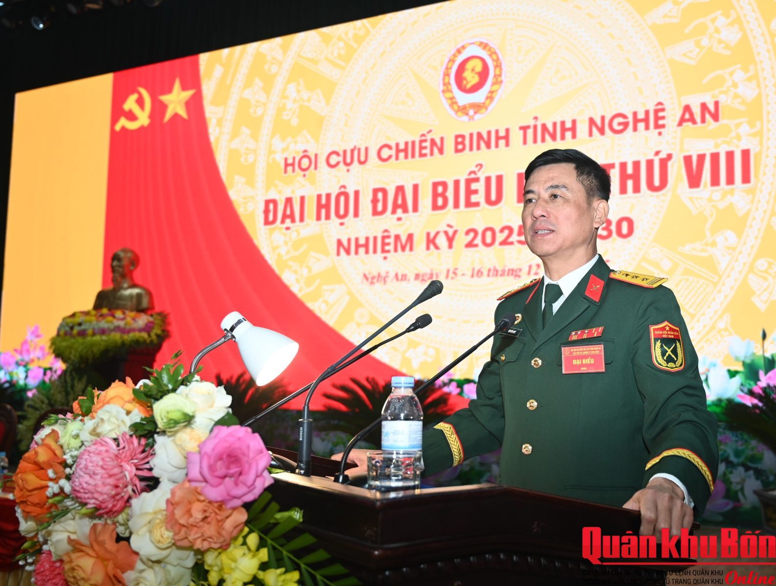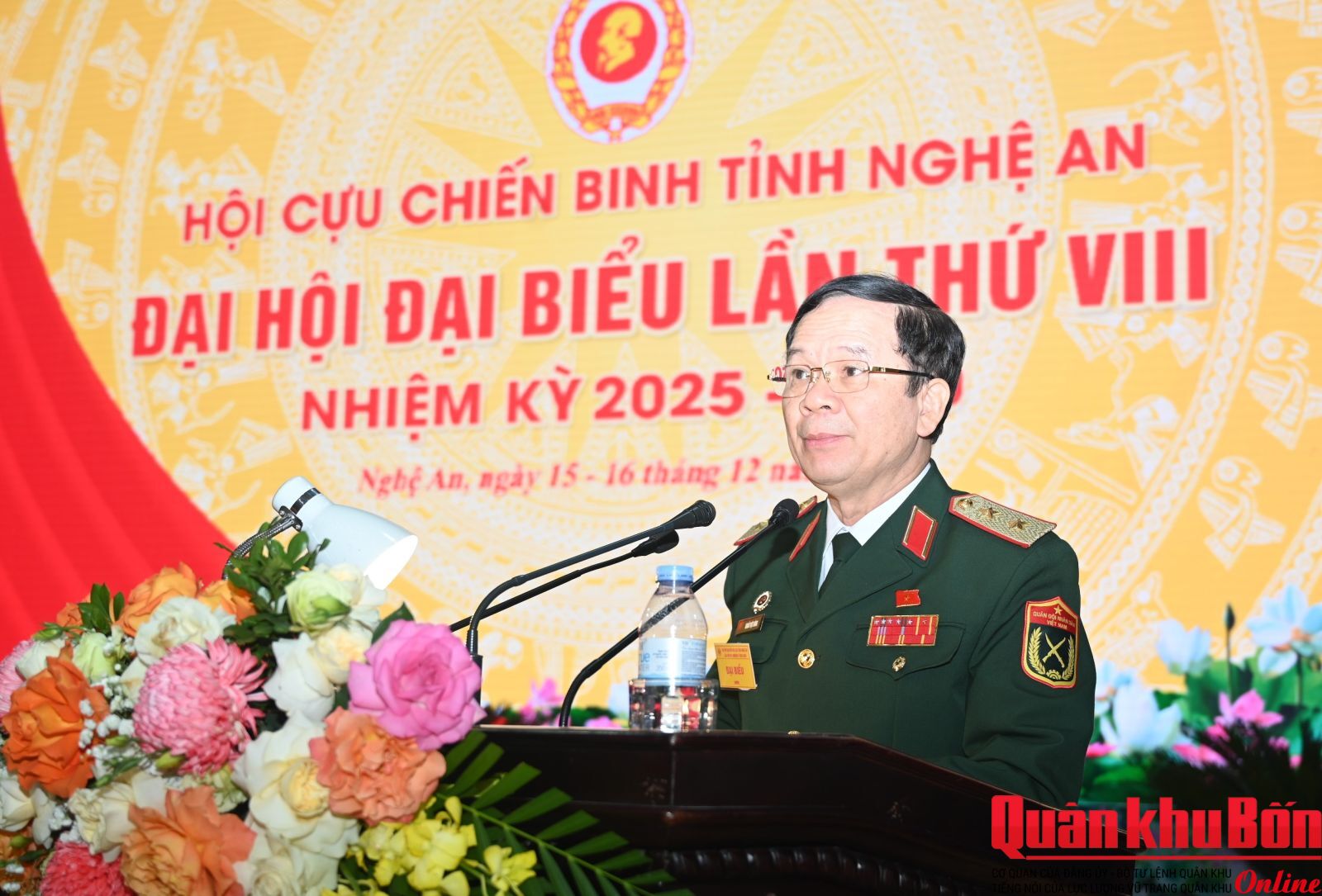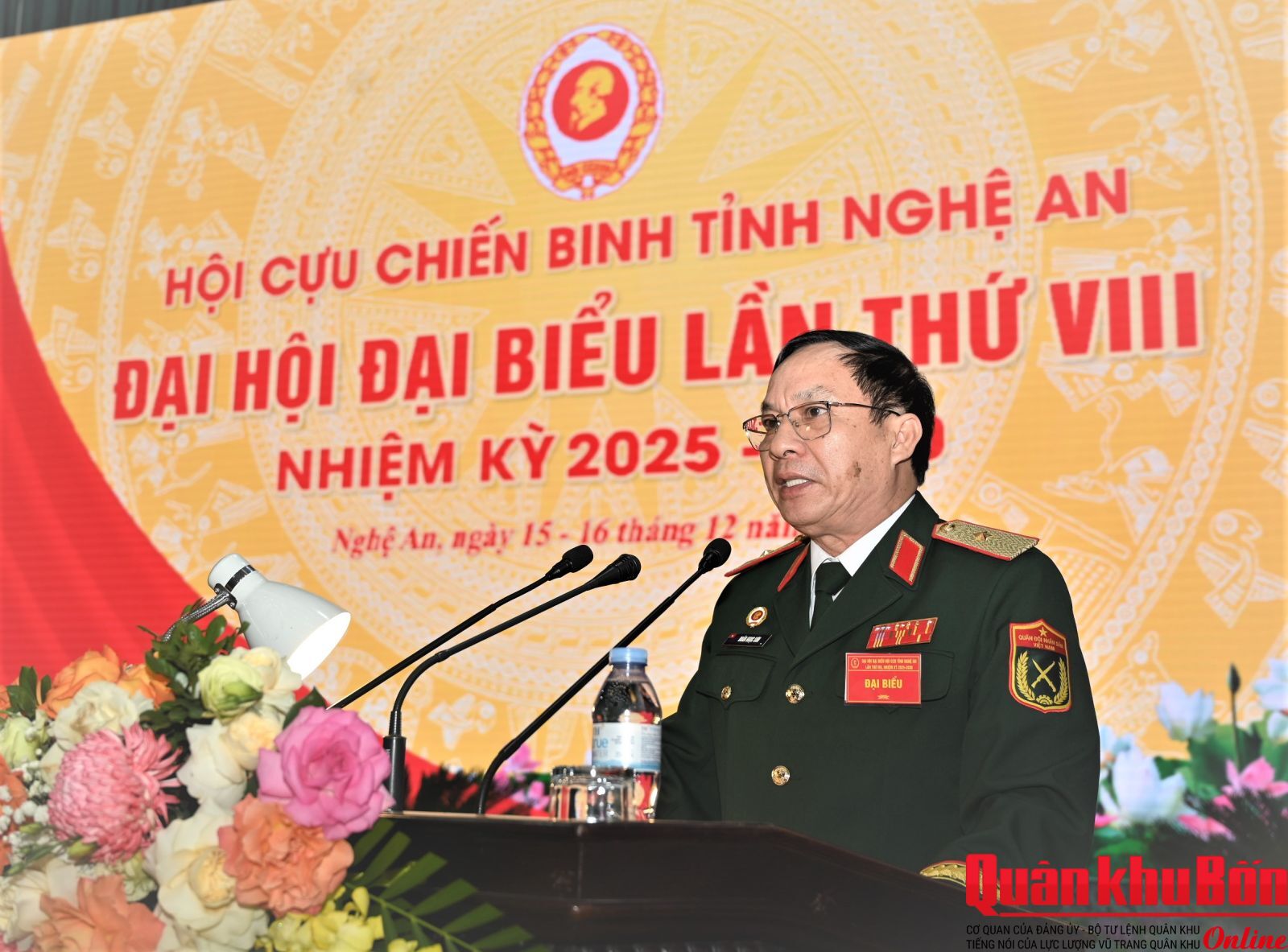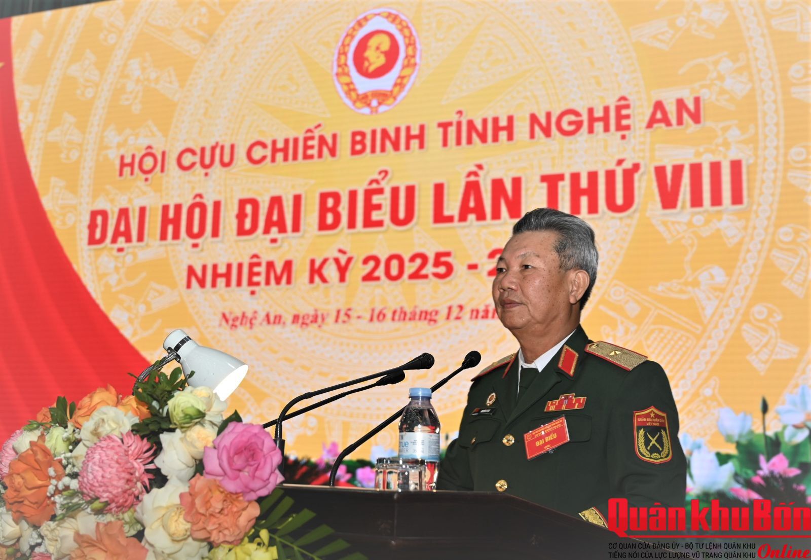 Trong hai ngày 15 – 16/12/2025, tại phường Trường Vinh, tỉnh Nghệ An, Hội Cựu chiến binh (CCB) tỉnh Nghệ An đã tổ chức Đại hội đại biểu lần thứ VIII, nhiệm kỳ 2025 - 2030. Trung tướng Khuất Việt Dũng, Phó Chủ tịch Trung ương Hội CCB Việt Nam dự, chỉ đạo Đại hội. Thiếu tướng Lê Văn Trung, Ủy viên Ban Thường vụ Đảng ủy, Phó Chính ủy Quân khu 4; đồng chí Hoàng Nghĩa Hiếu, Phó Bí thư Thường trực Tỉnh ủy Nghệ An; đồng chí Võ Trọng Hải, Phó Bí thư Tỉnh ủy, Chủ tịch Ủy ban Nhân dân tỉnh Nghệ An; các đồng chí trong Ban Thường vụ Tỉnh ủy, lãnh đạo Hội đồng Nhân dân, Ủy ban Nhân dân, Ủy ban Mặt trận Tổ quốc Việt Nam tỉnh Nghệ An và 251 đại biểu đại diện cho toàn thể hội viên Hội CCB trong toàn tỉnh dự Đại hội.