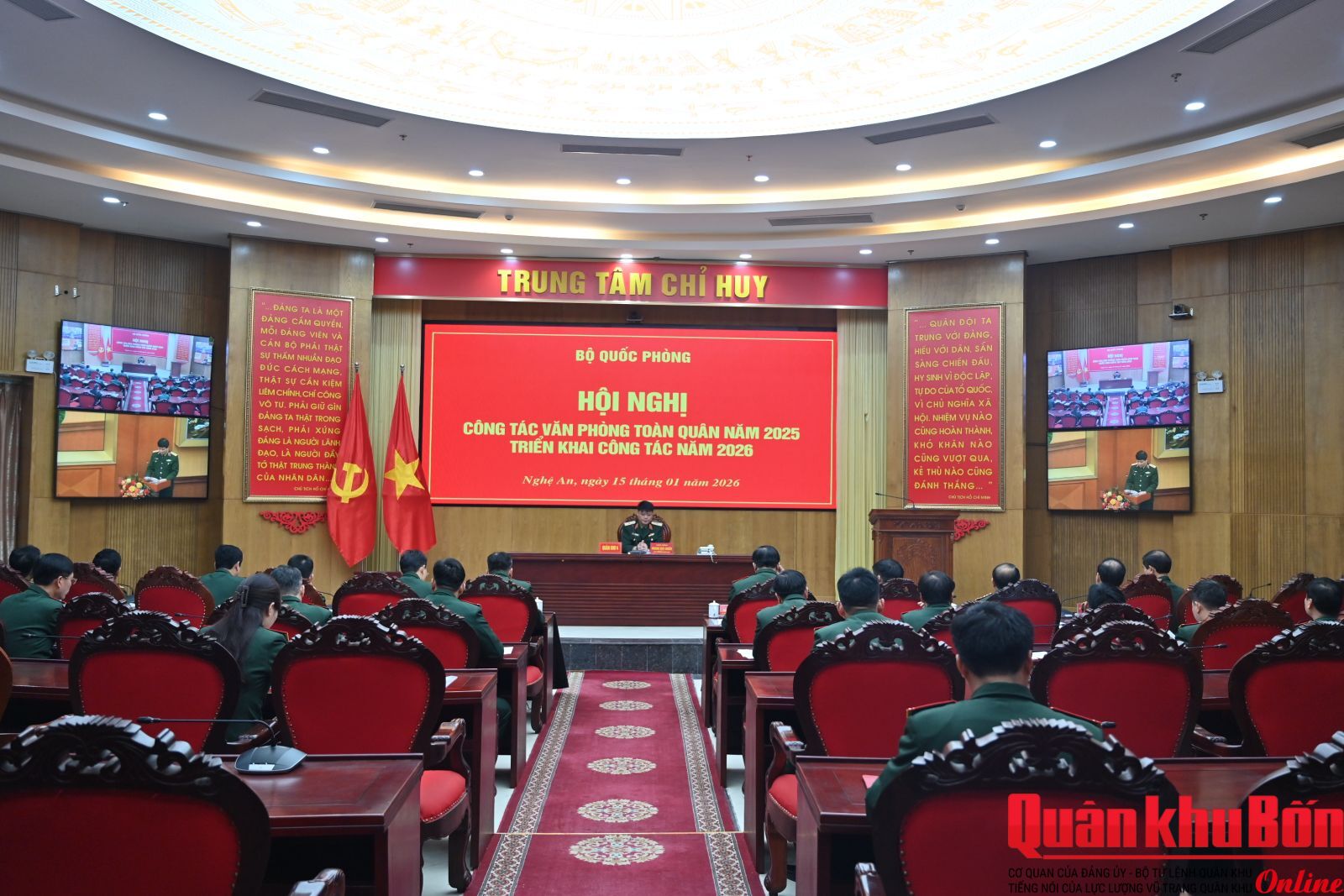 Triển khai phương hướng, nhiệm vụ năm 2026, ngành Văn phòng toàn quân tiếp tục chủ động, nhạy bén, nâng cao hơn nữa năng lực nghiên cứu, tham mưu, tổng hợp giúp Thường vụ Quân ủy Trung ương, Quân ủy Trung ương, Bộ Quốc phòng và cấp ủy, chỉ huy các cấp xây dựng, triển khai chặt chẽ, chất lượng, hiệu quả chương trình, kế hoạch công tác, đáp ứng yêu cầu lãnh đạo, chỉ đạo thực hiện nhiệm vụ quân sự, quốc phòng, xây dựng quân đội, cơ quan, đơn vị.