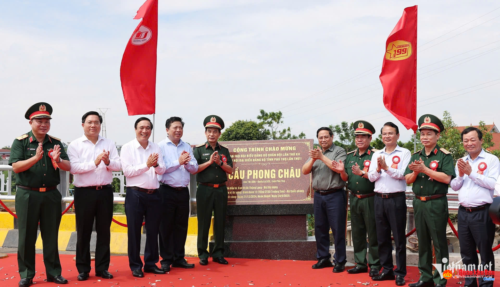 "Đến hôm nay, cầu Phong Châu đã hoàn thành, về đích đúng mục tiêu mà Tổng Bí thư, Chính phủ và Bộ Quốc phòng đã giao, đặc biệt là đúng vào dịp chào mừng Đại hội Đảng bộ Quân đội", Thủ tướng nhấn mạnh.