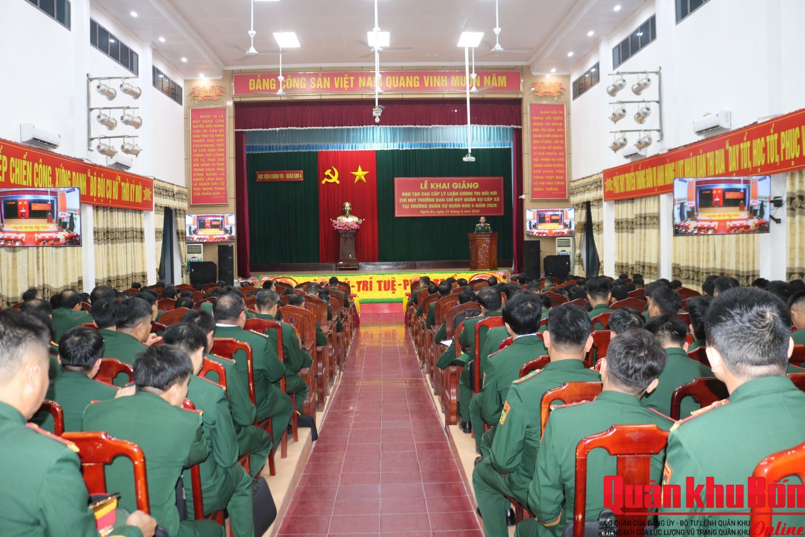 Sáng 21/4/2026, tại Trường Quân sự Quân khu 4, Học viện Chính trị phối hợp với Quân khu 4 tổ chức lễ khai giảng lớp đào tạo cao cấp lý luận chính trị đối với Chỉ huy trưởng Ban Chỉ huy Quân sự (CHQS) cấp xã.